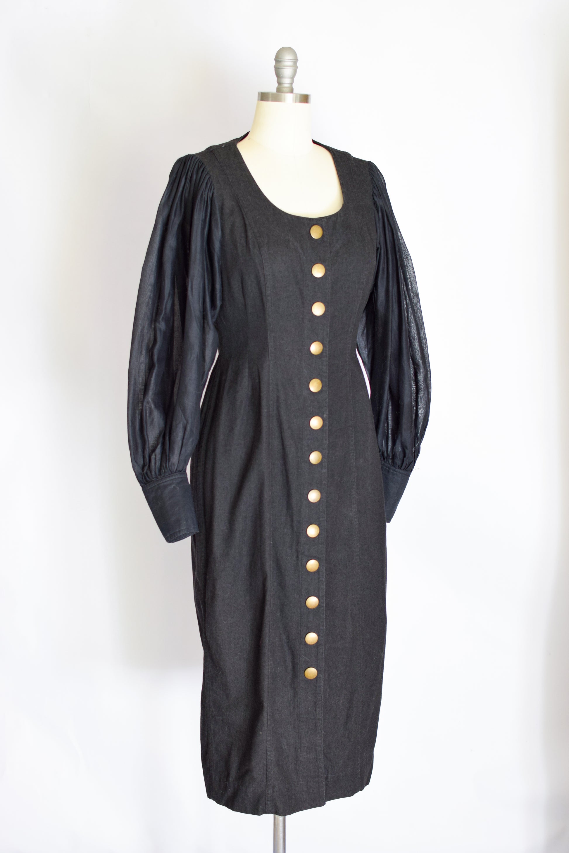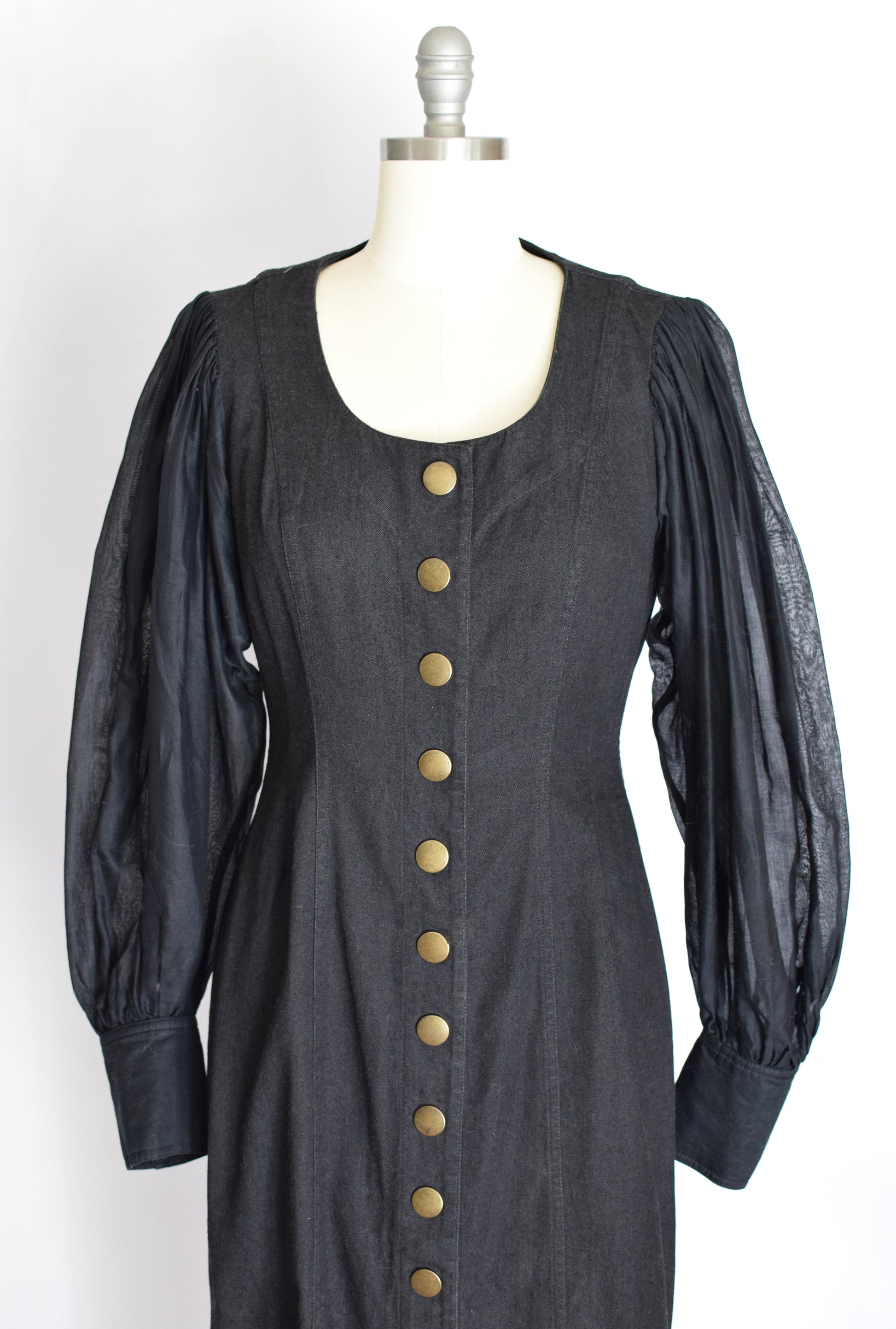 fitted black denim sheath with large brass snaps down the front and sheer balloon sleeves with denim cuffs. denim has slight stretch to it.