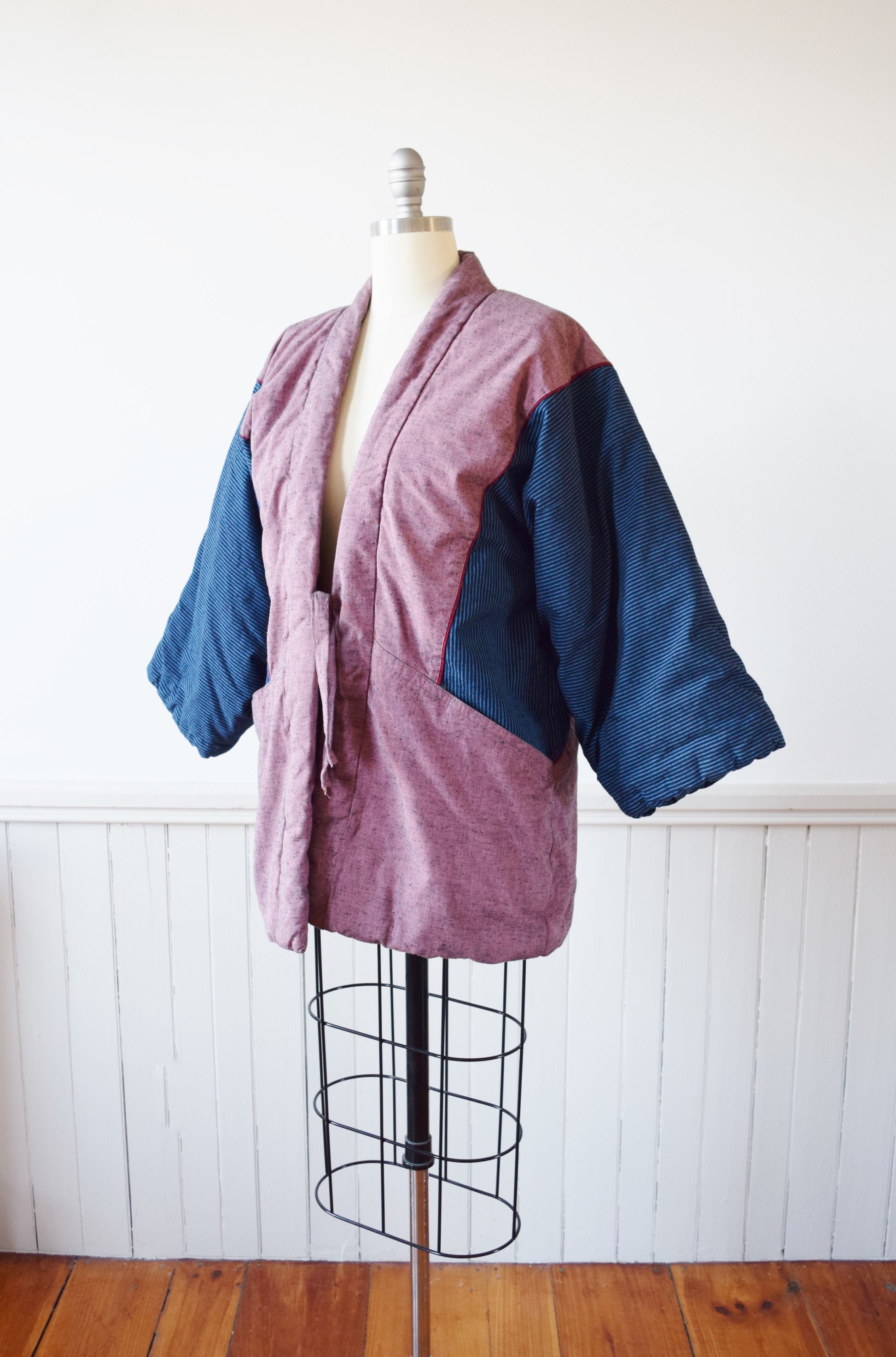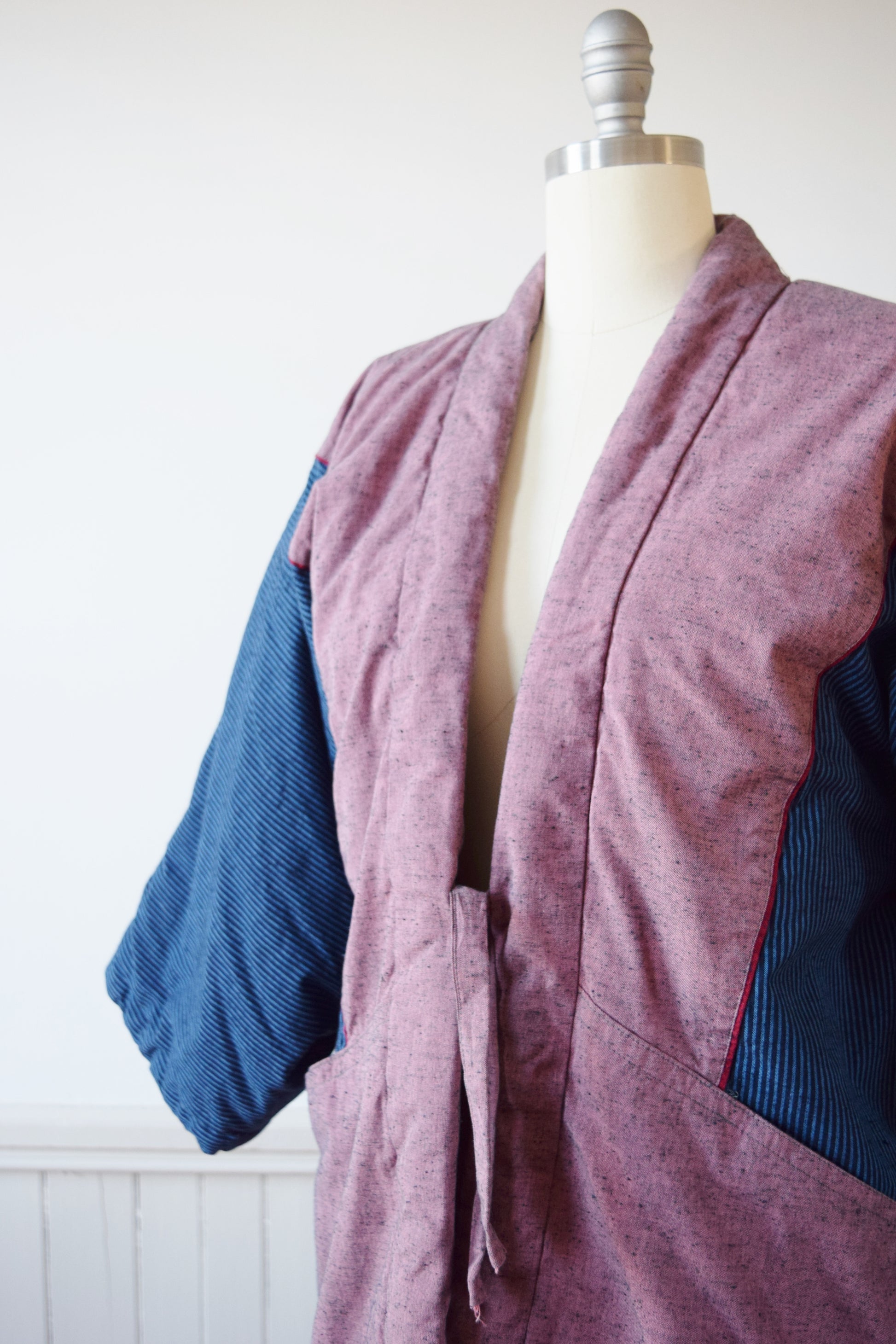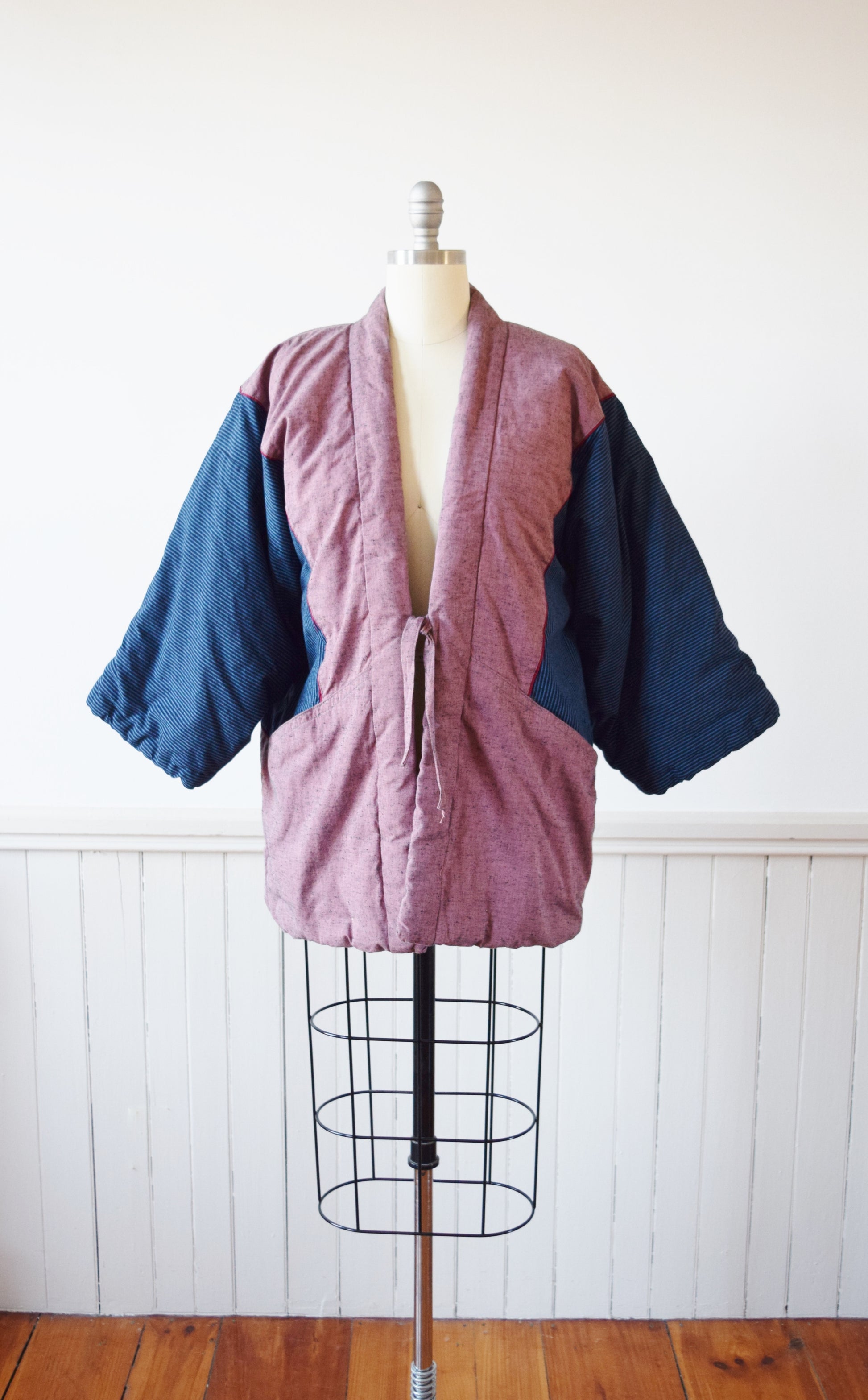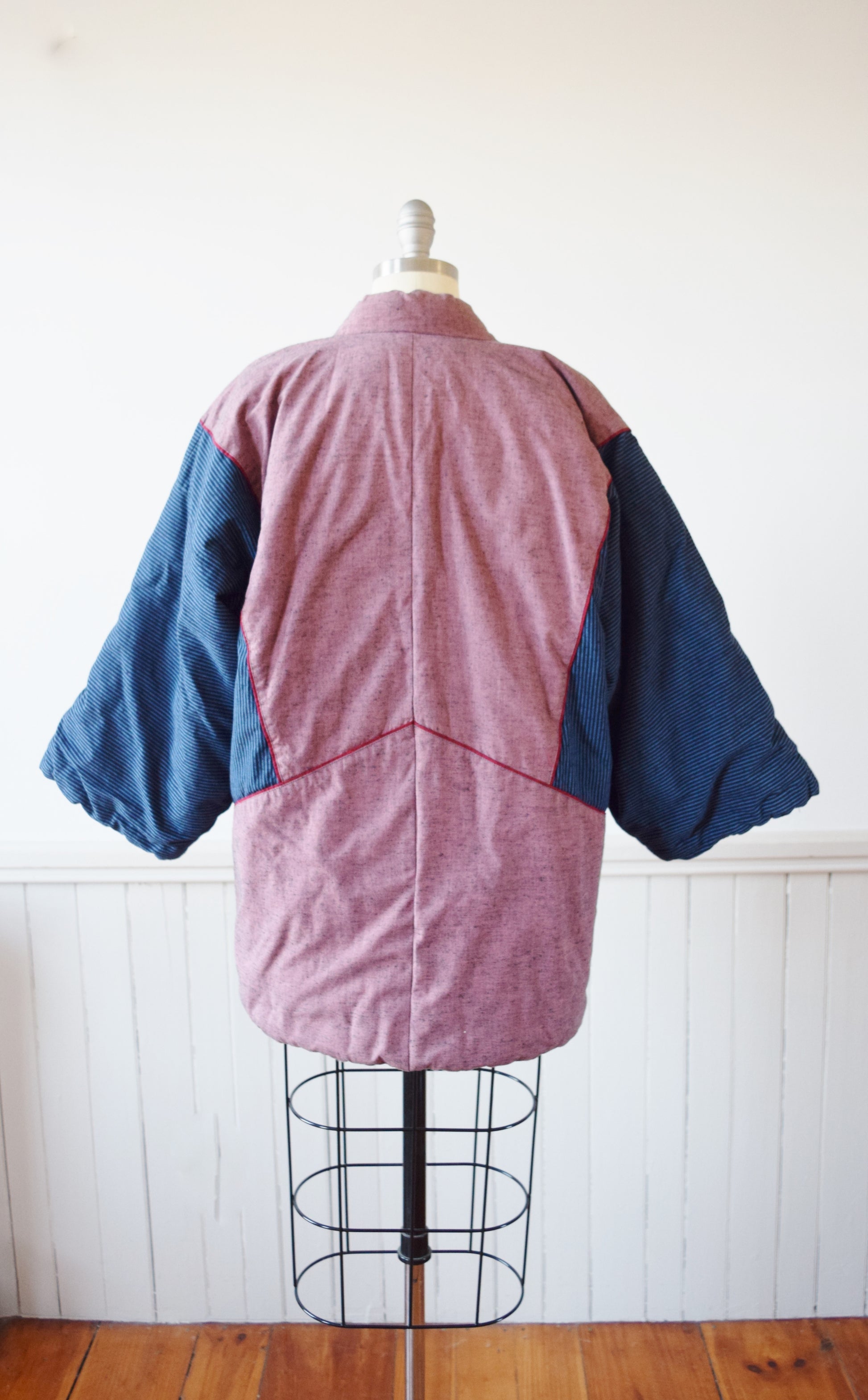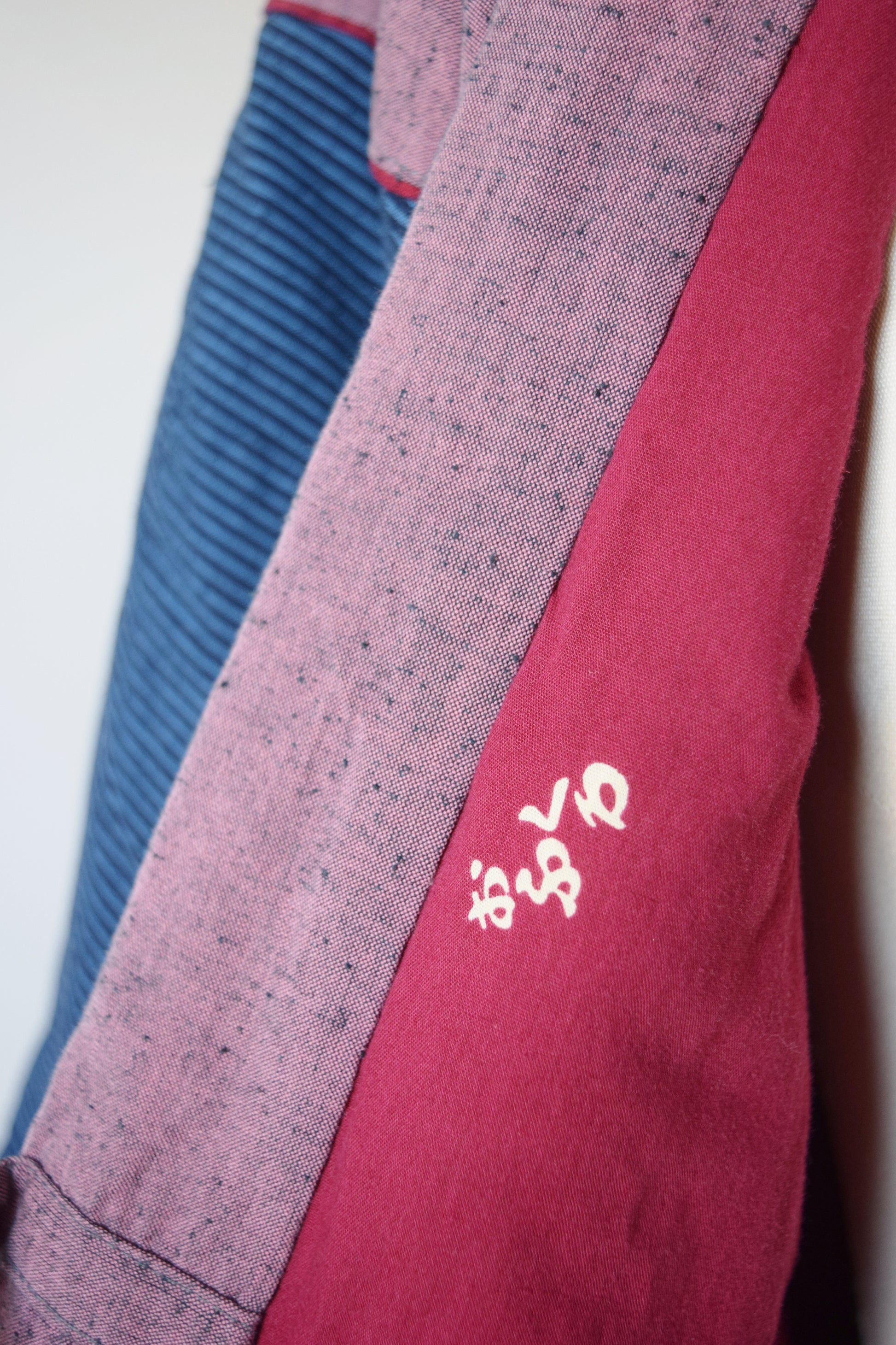 cotton colorblock construction in a grey-dotted pink and blue-on-blue striped fabric with pink/red piping, and a muted pink/red lining with Japanese characters. hip pockets.