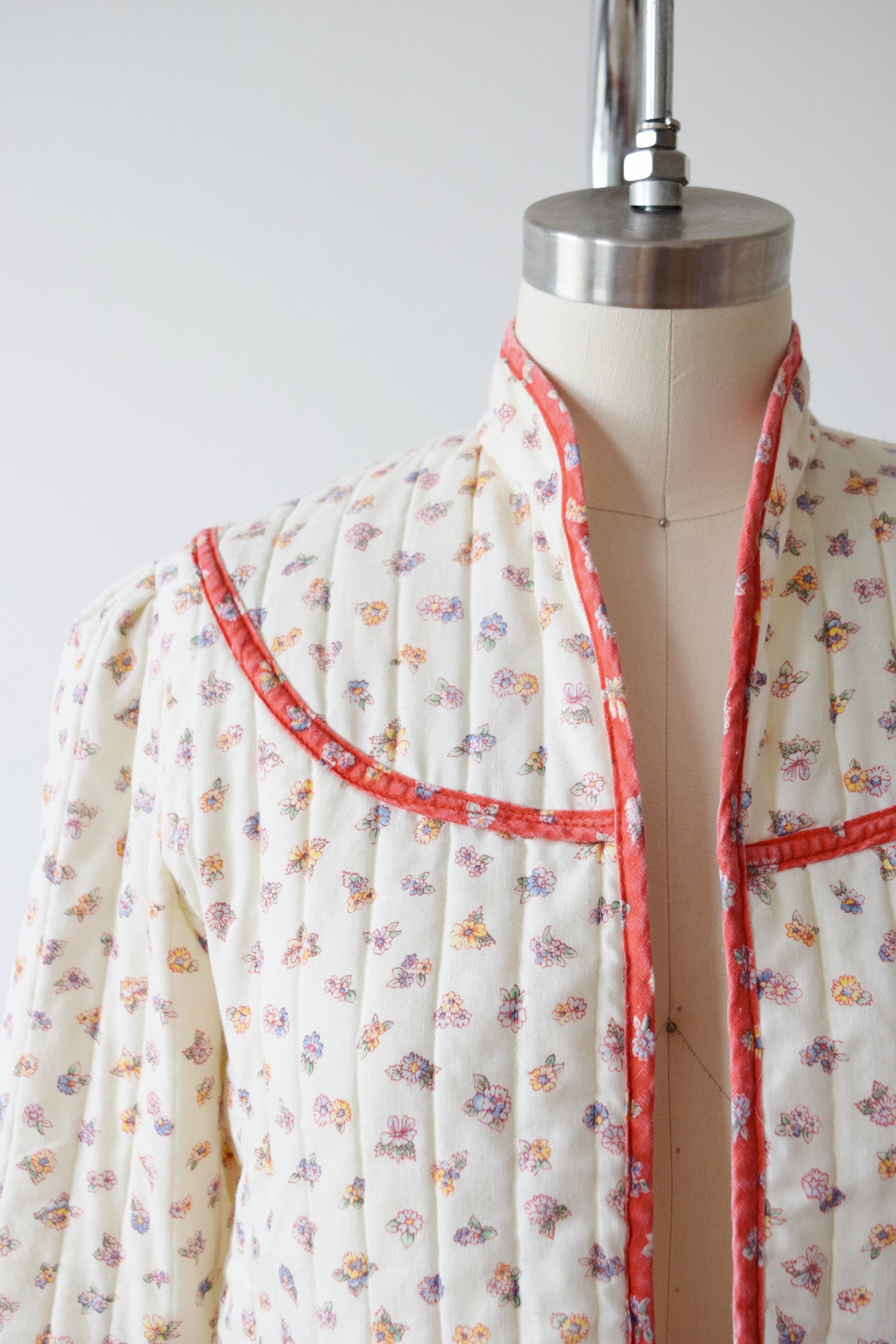 cropped quilted jacket in a cotton blend with little puff sleeves and yoked neck. antique inspired cream floral print trimmed with perfectly faded red.