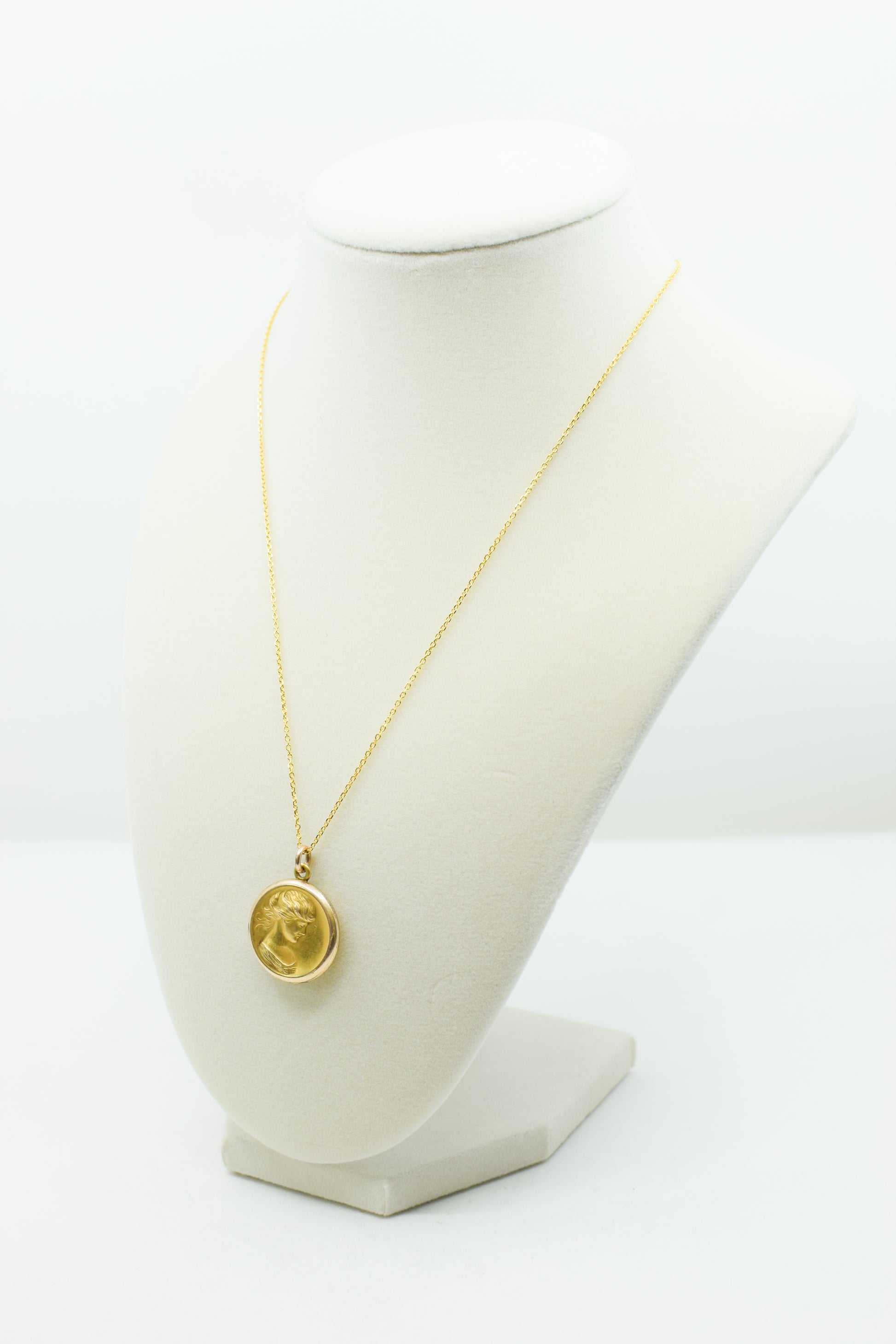 soft yellow goldfill finish. romantic design in relief of a young woman in profile, with windswept hair. hinges open to reveal two spaces for displaying photos or other tiny talismans. one original removeable frame and cover. sold with a modern 12kt goldfill chain.