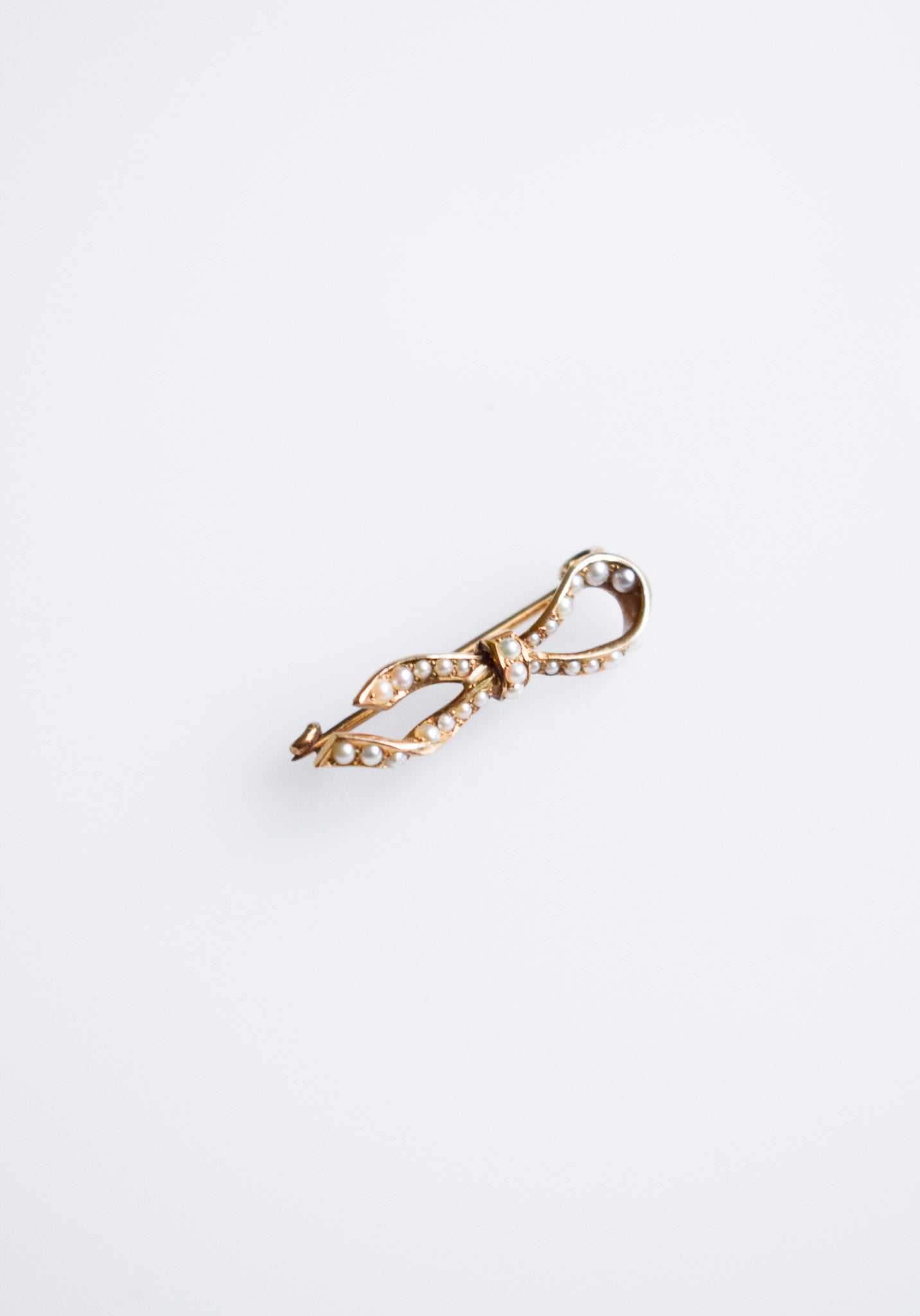 diminutive 14 karat gold ribbon-form pin set with seed pearls. very nicely rendered. would be perfect for a shirt collar or lapel.
