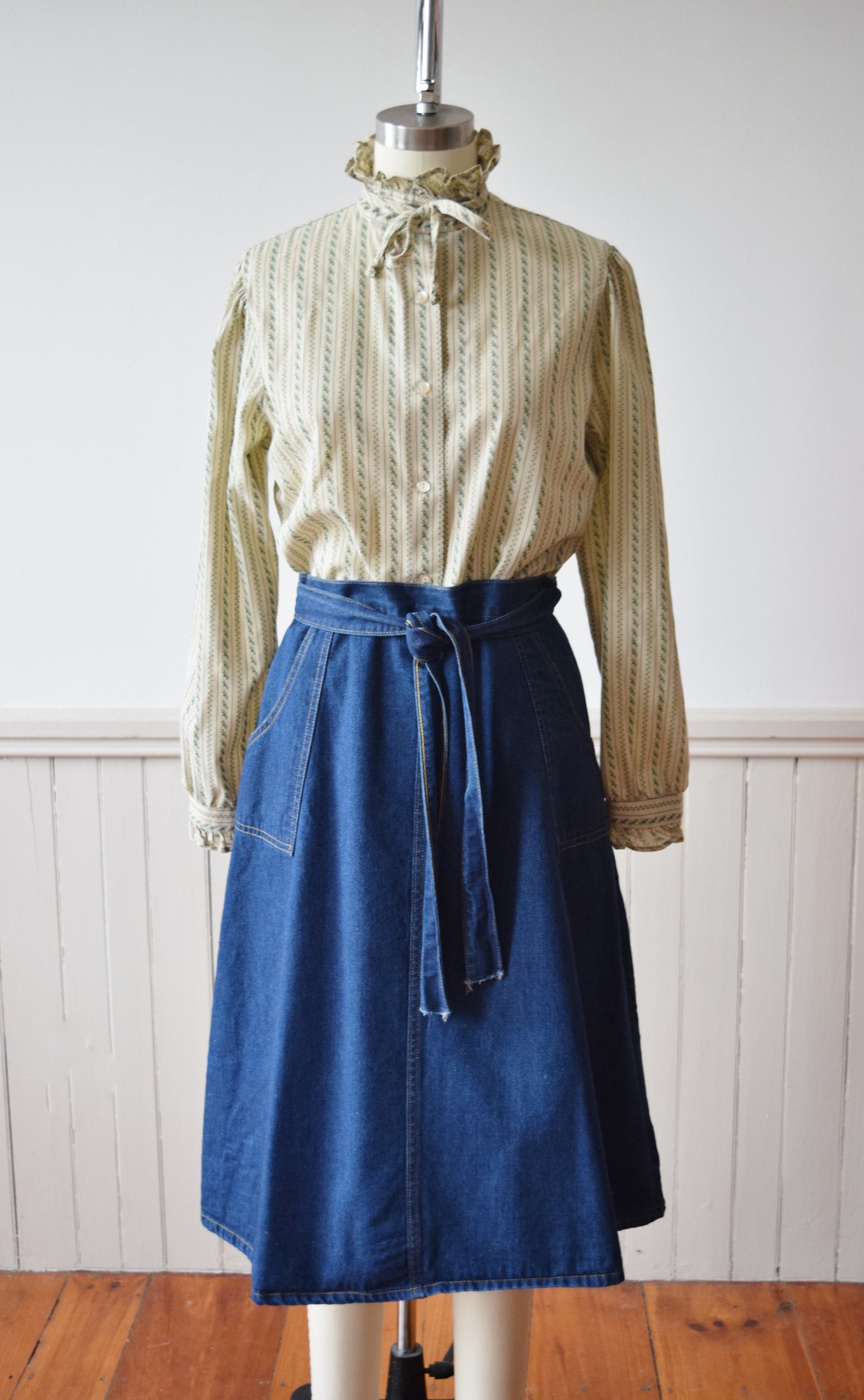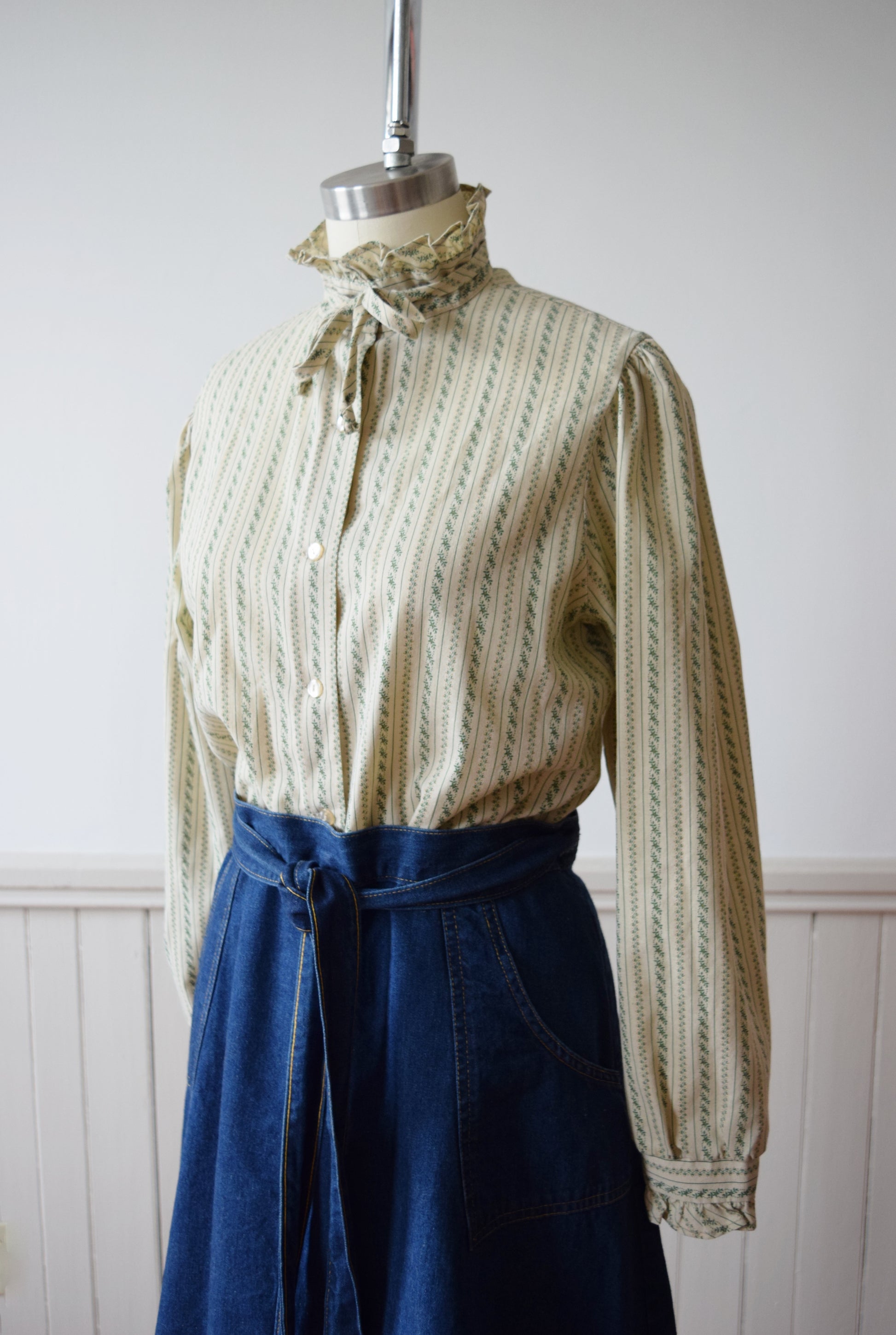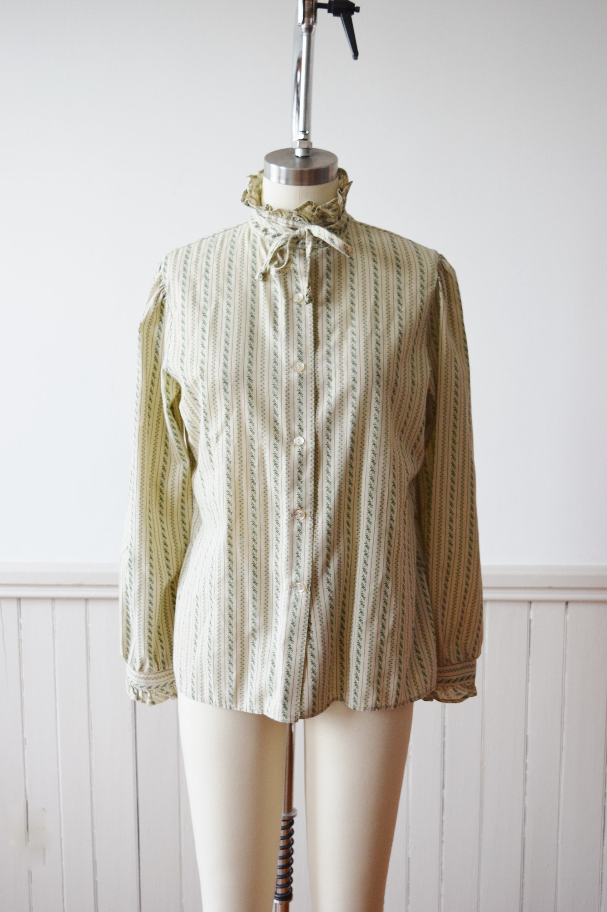 Folk inspired green on beige floral print. Ruffled collar and cuffs. Sweet little neck tie and puff sleeves.