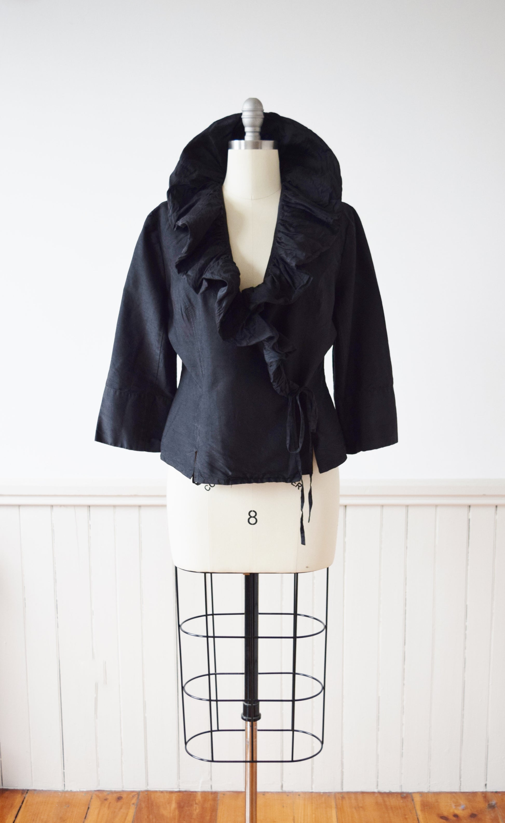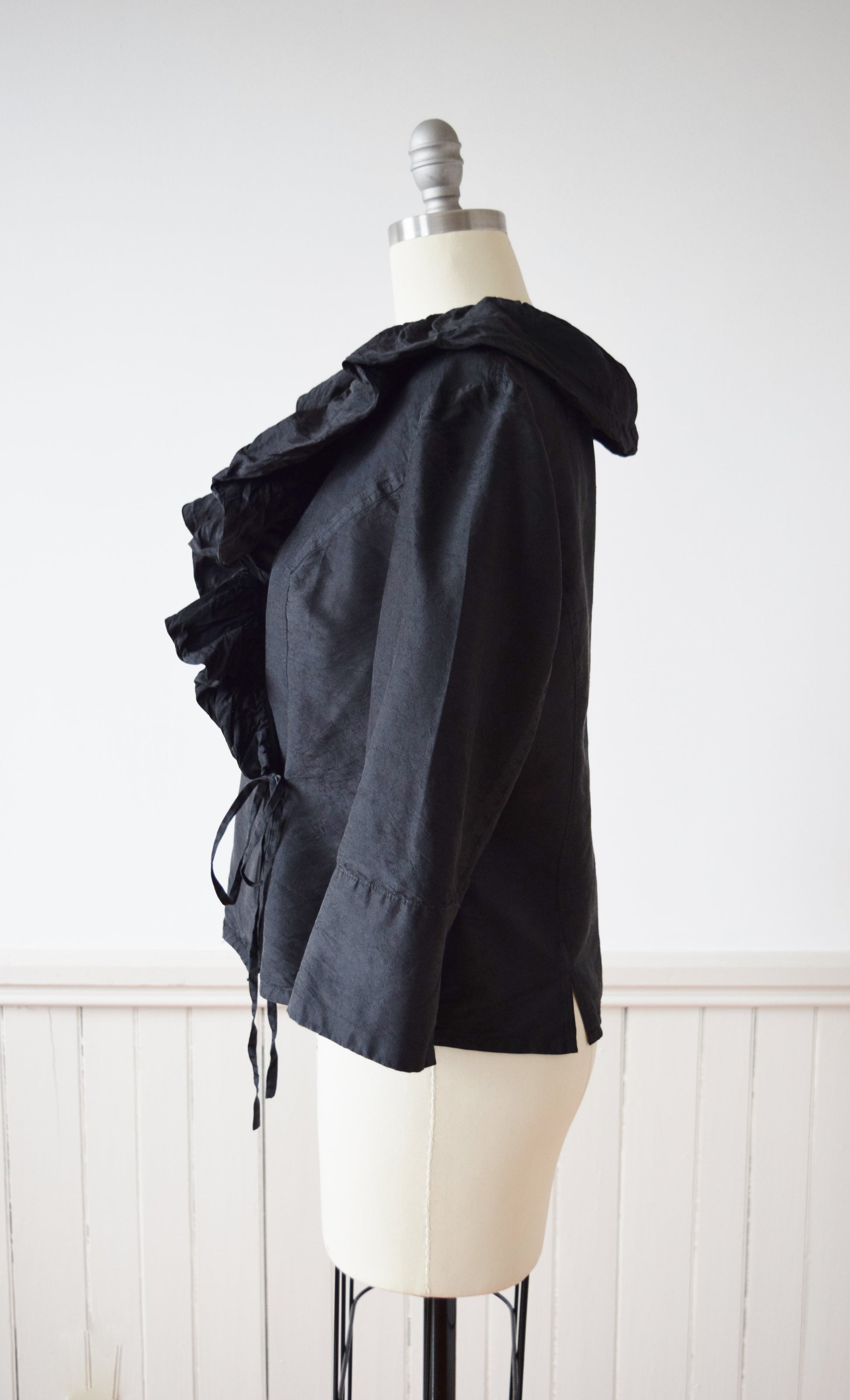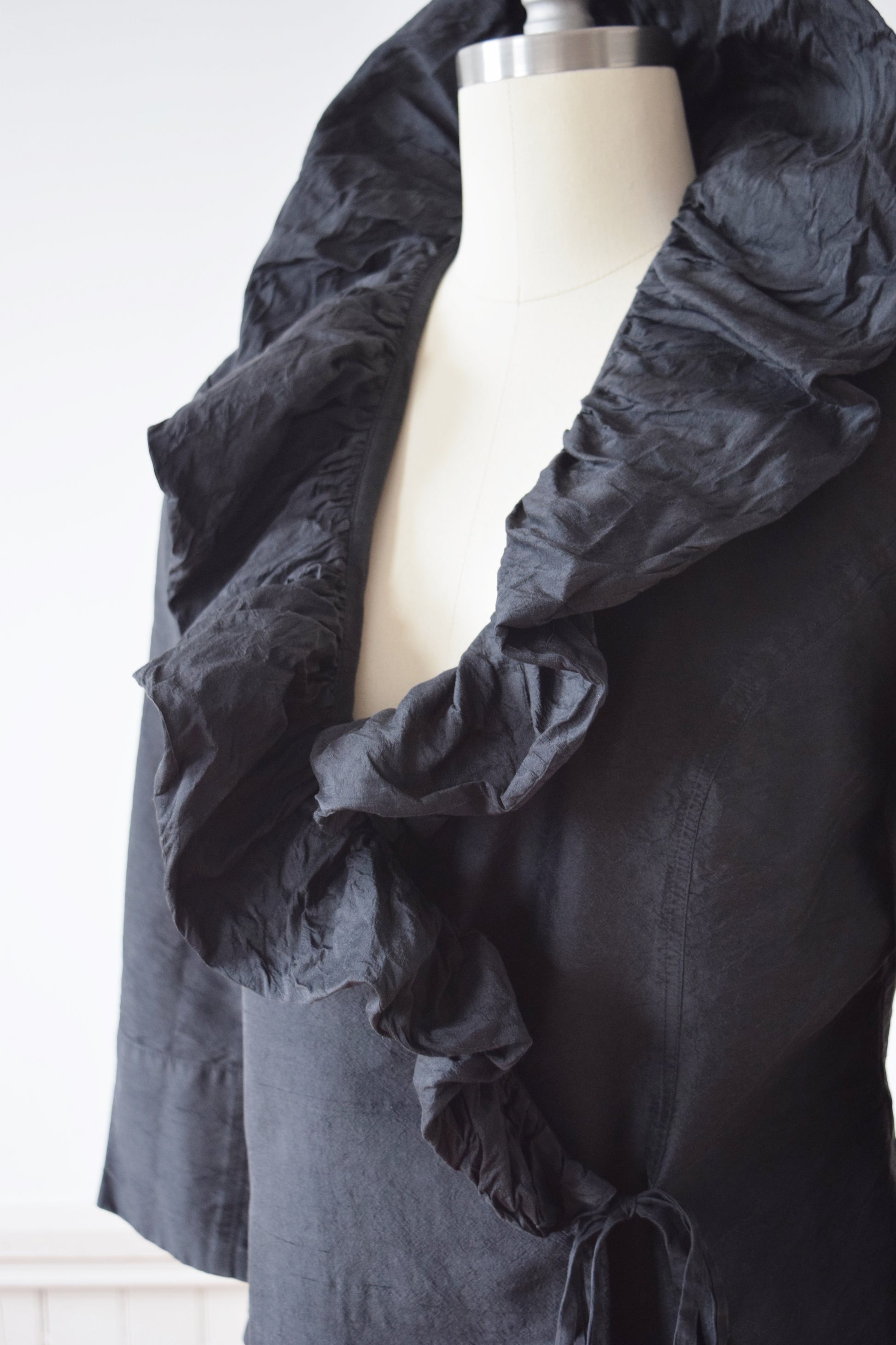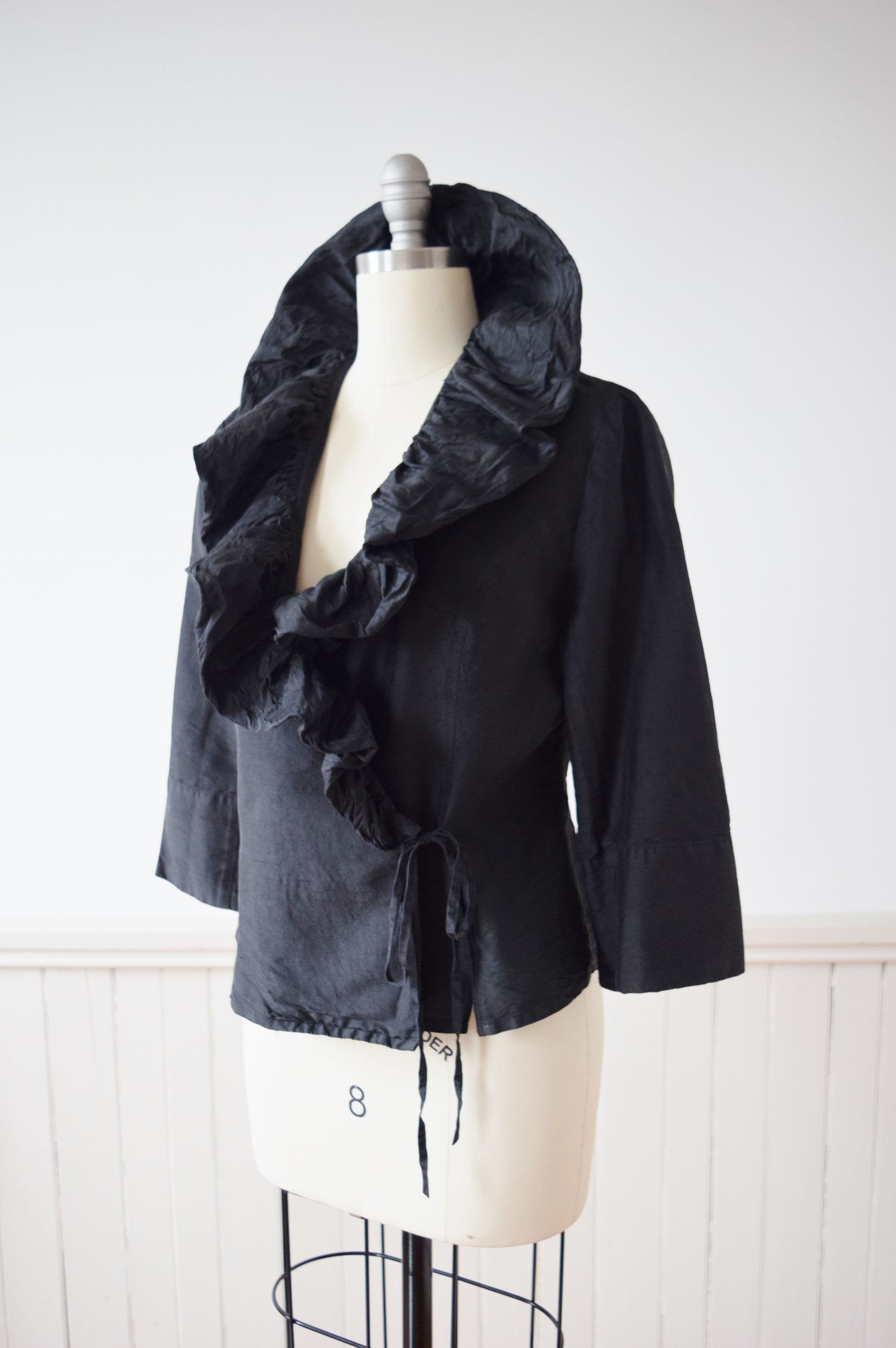 wrap style in washed black raw silk with dramatic ruffled collar. 3/4 length sleeves.