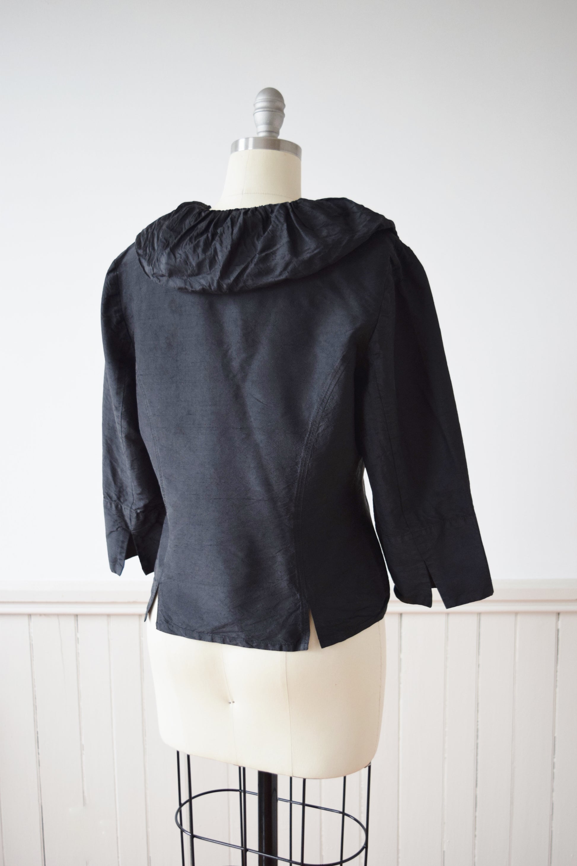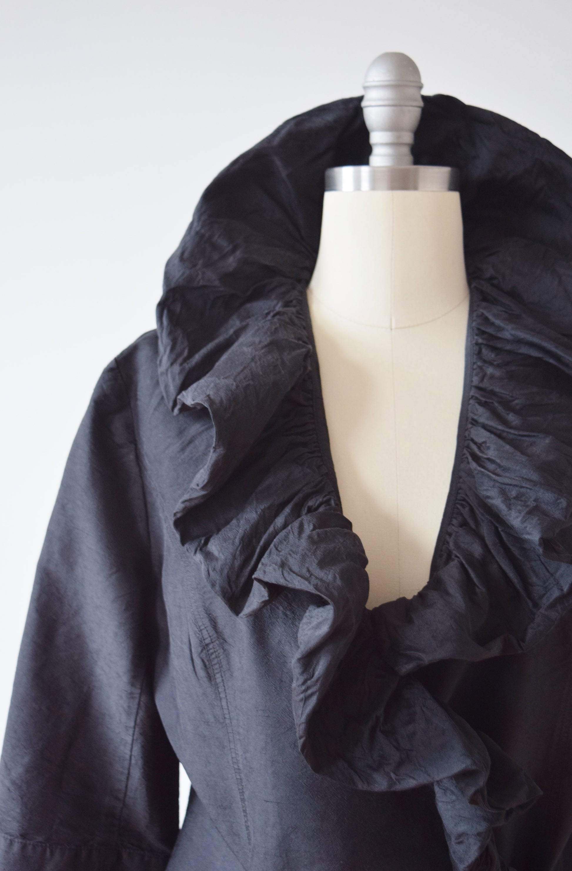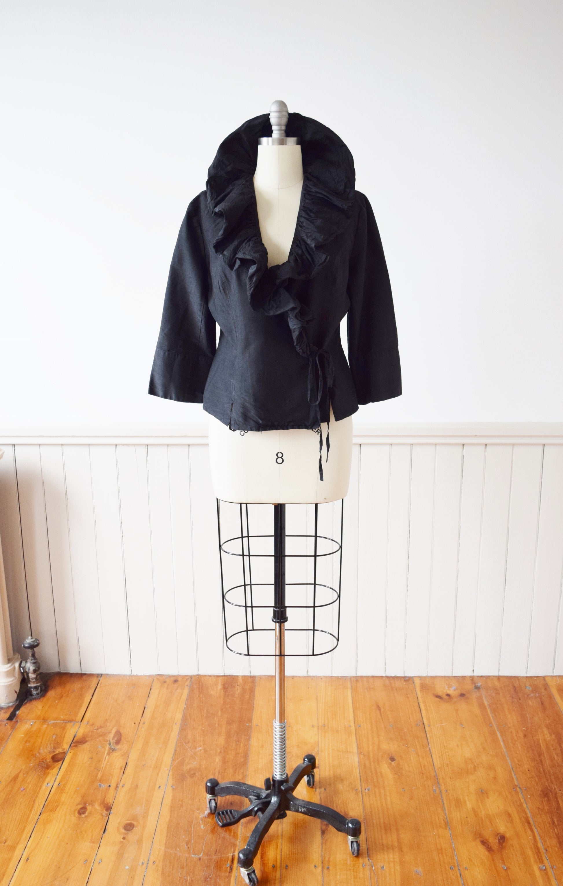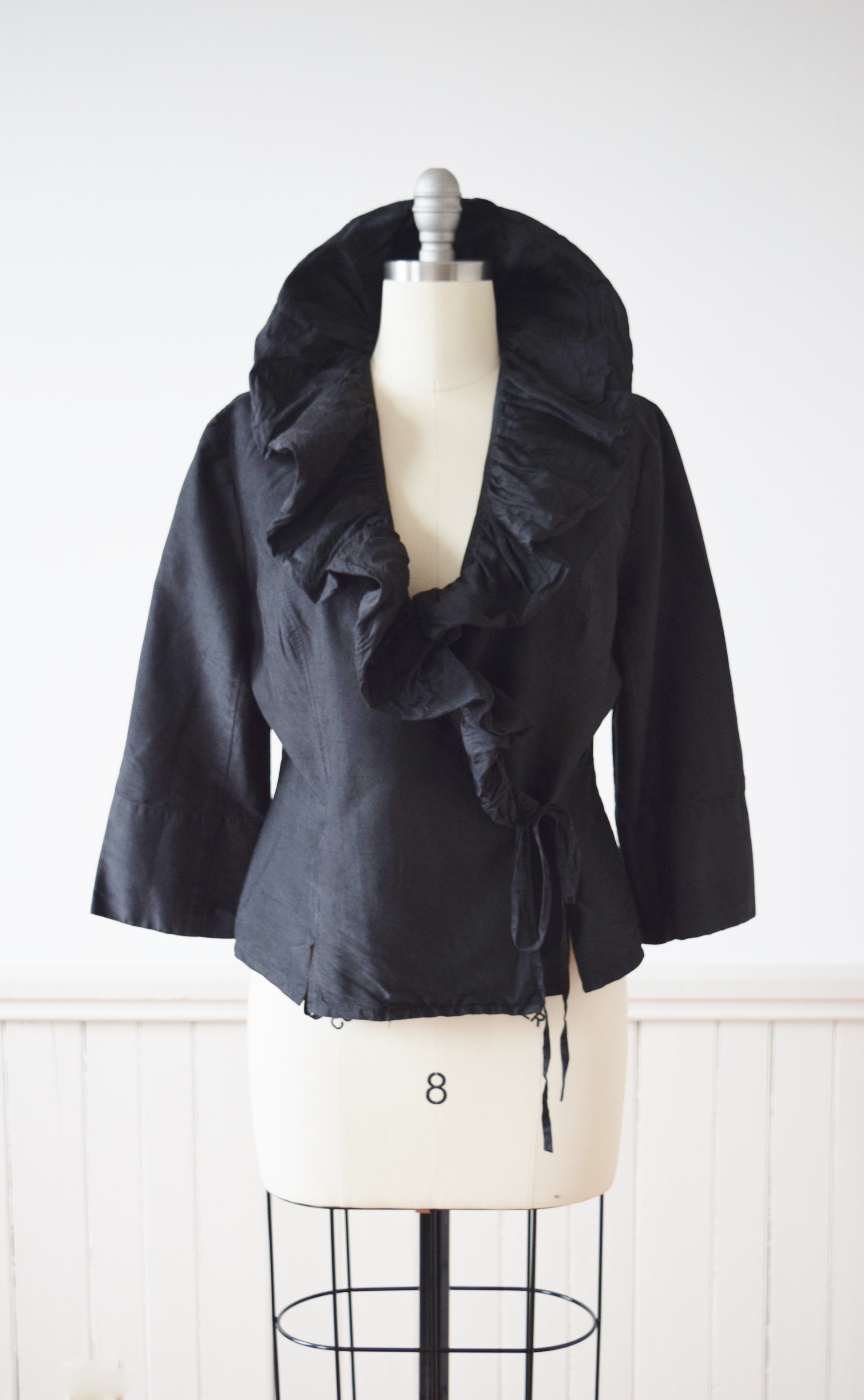 wrap style in washed black raw silk with dramatic ruffled collar. 3/4 length sleeves.