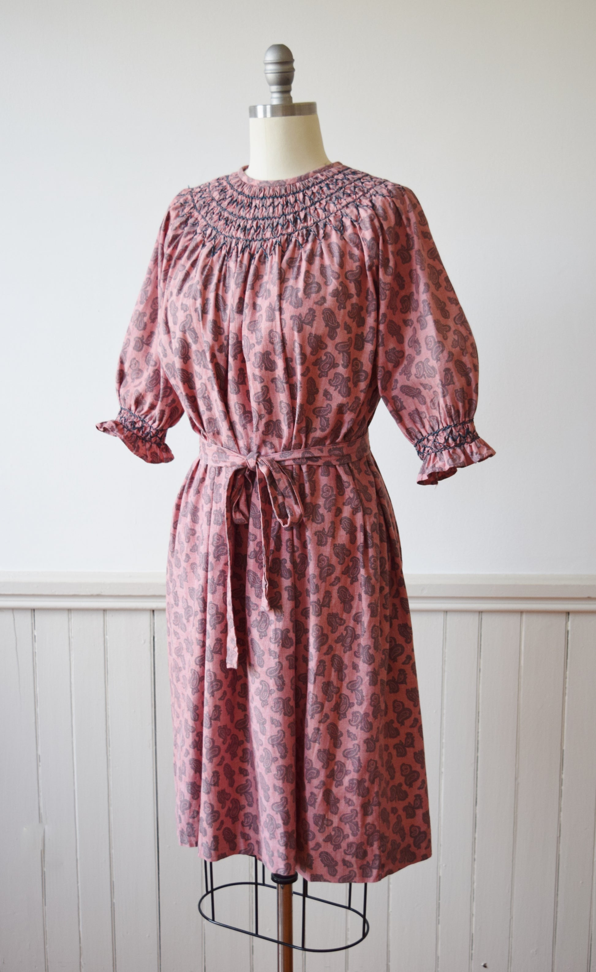 perfectly faded mauve paisley with black smocking at the neck and sleeve cuffs. optional tie belt.