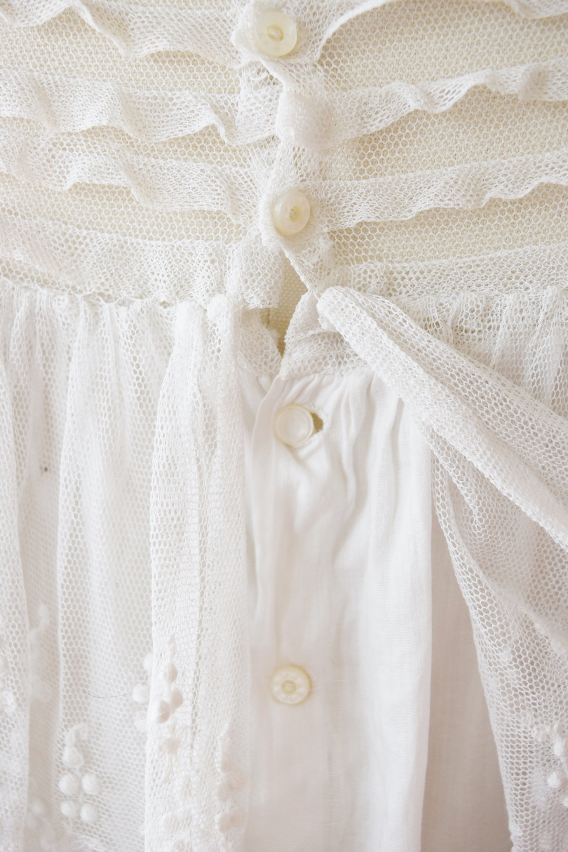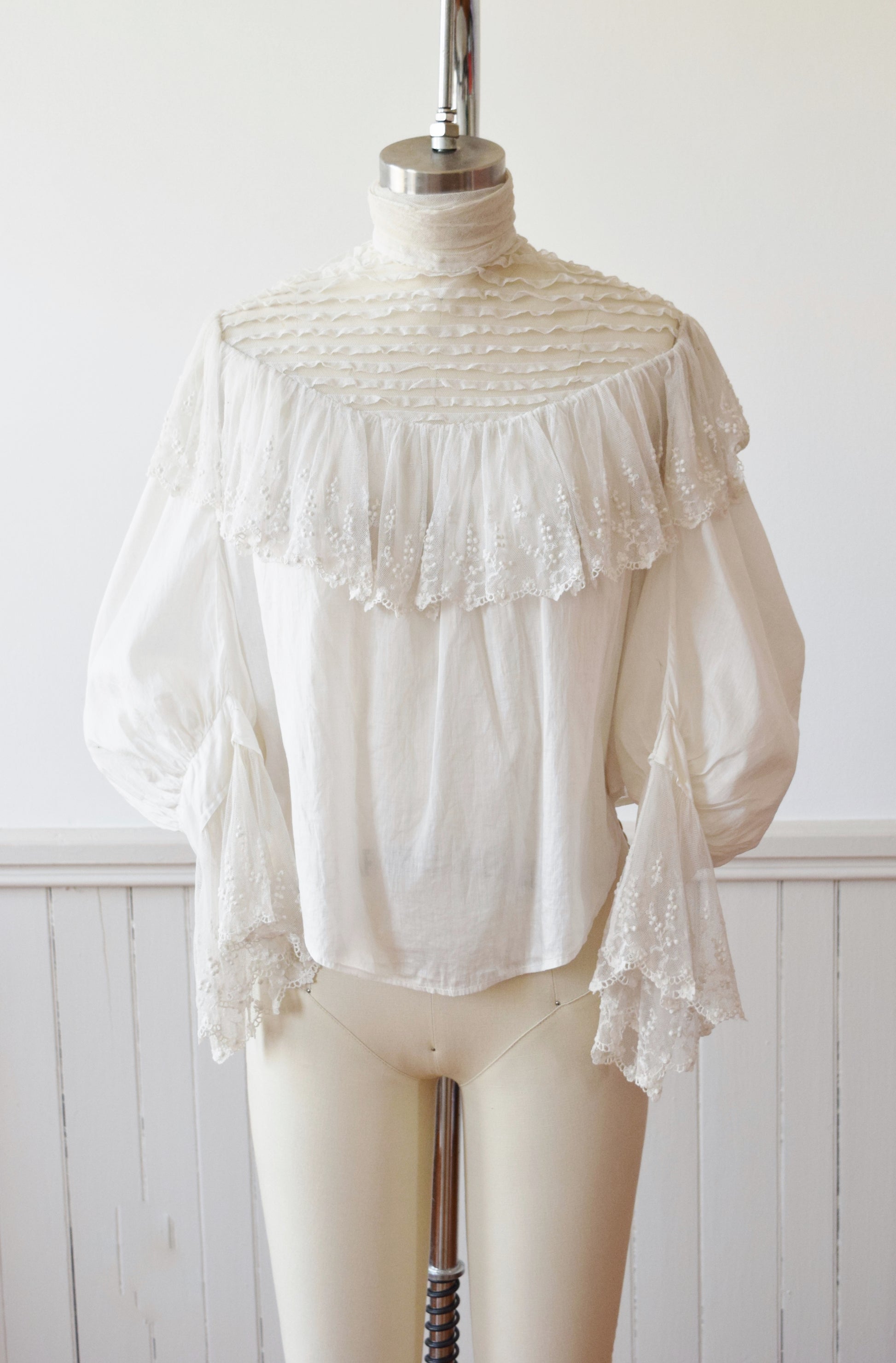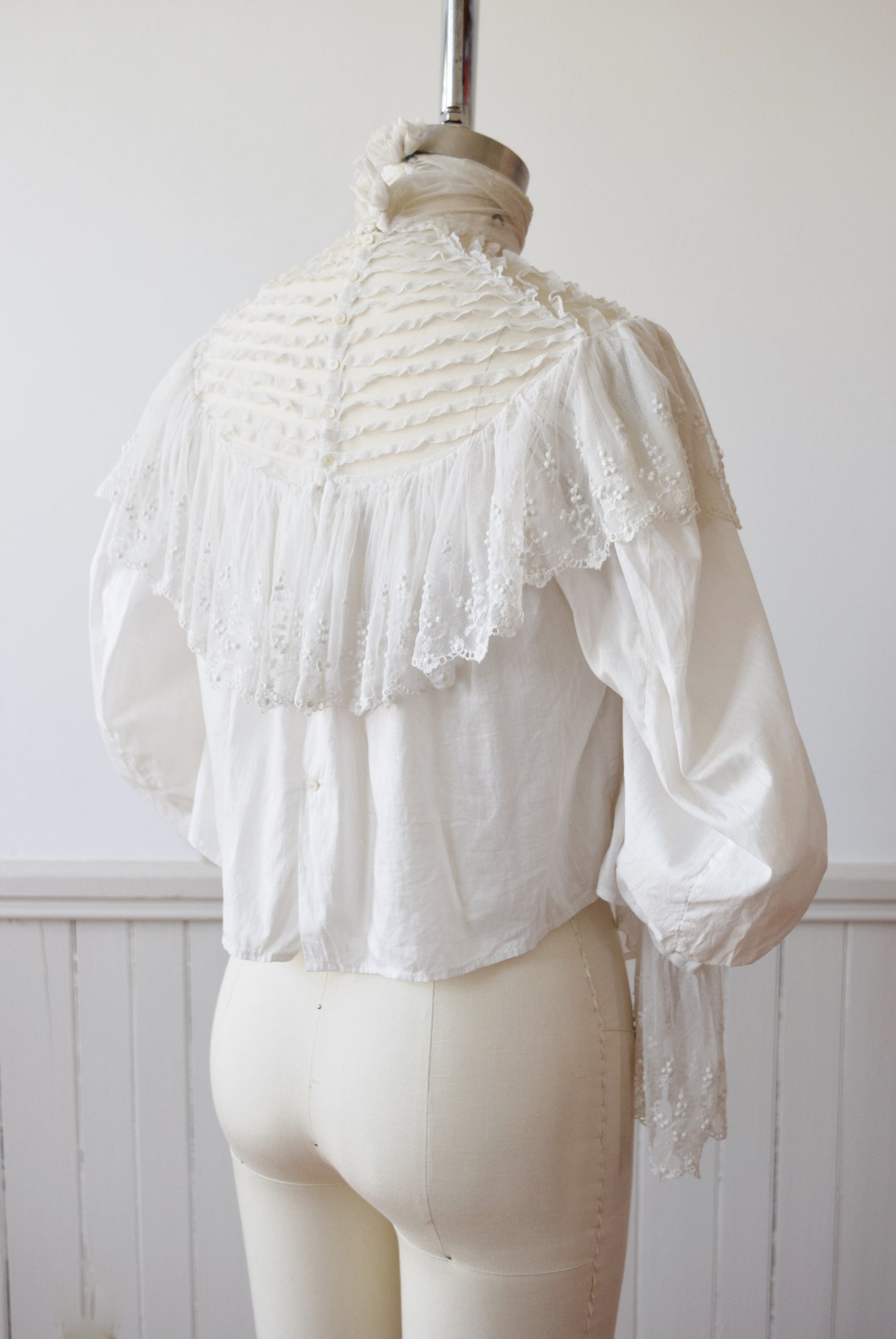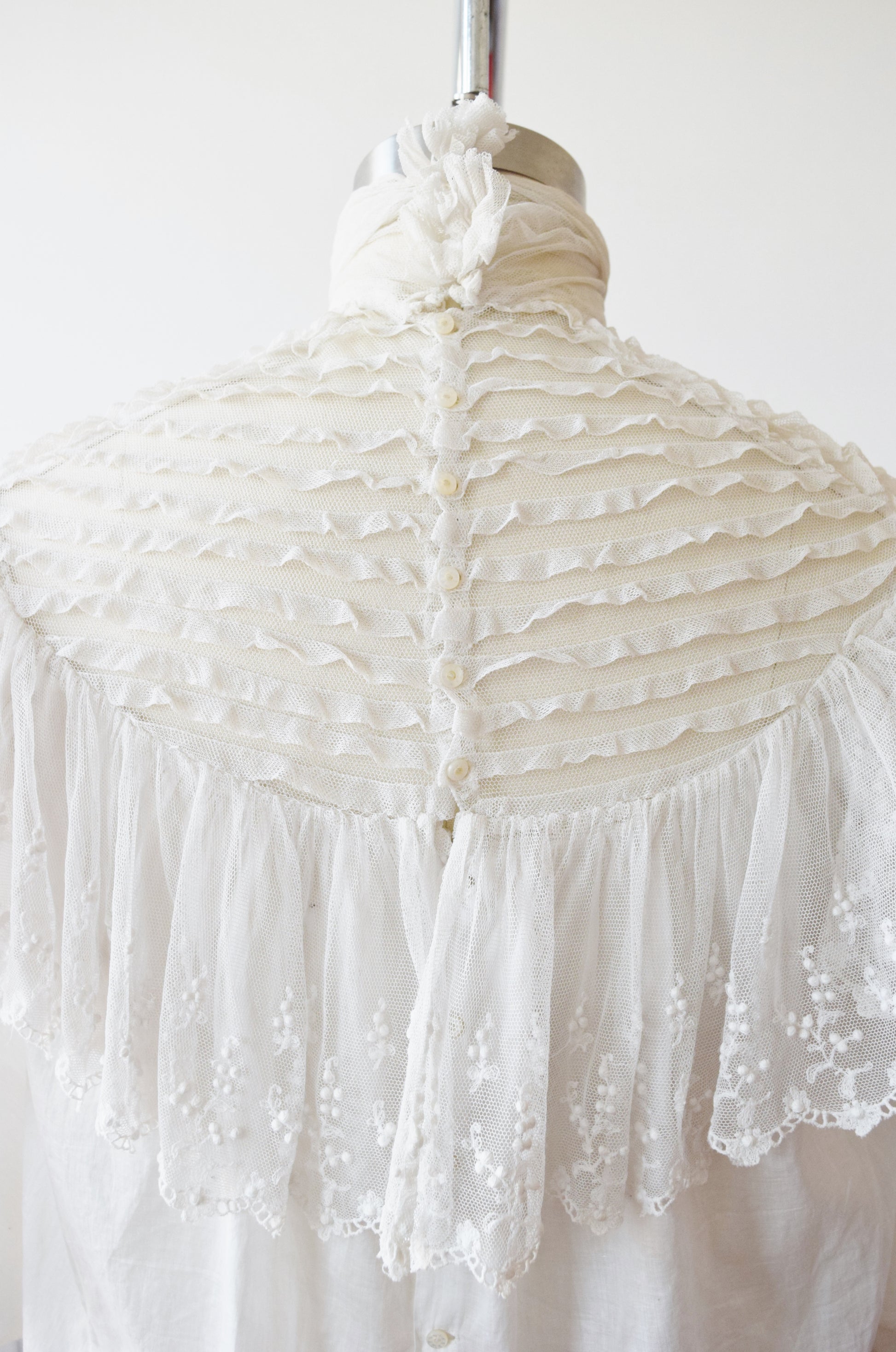 truly romantic in a fine + soft semi sheer white cotton batiste with pintucked netting across the shoulders and upper bodice. wide floral embroidered net ruffle draped across the shoulders and at the sleeve cuffs. large 3/4 length puff sleeves, cropped blouson cut. tiny mother of pearl buttons down the back.
