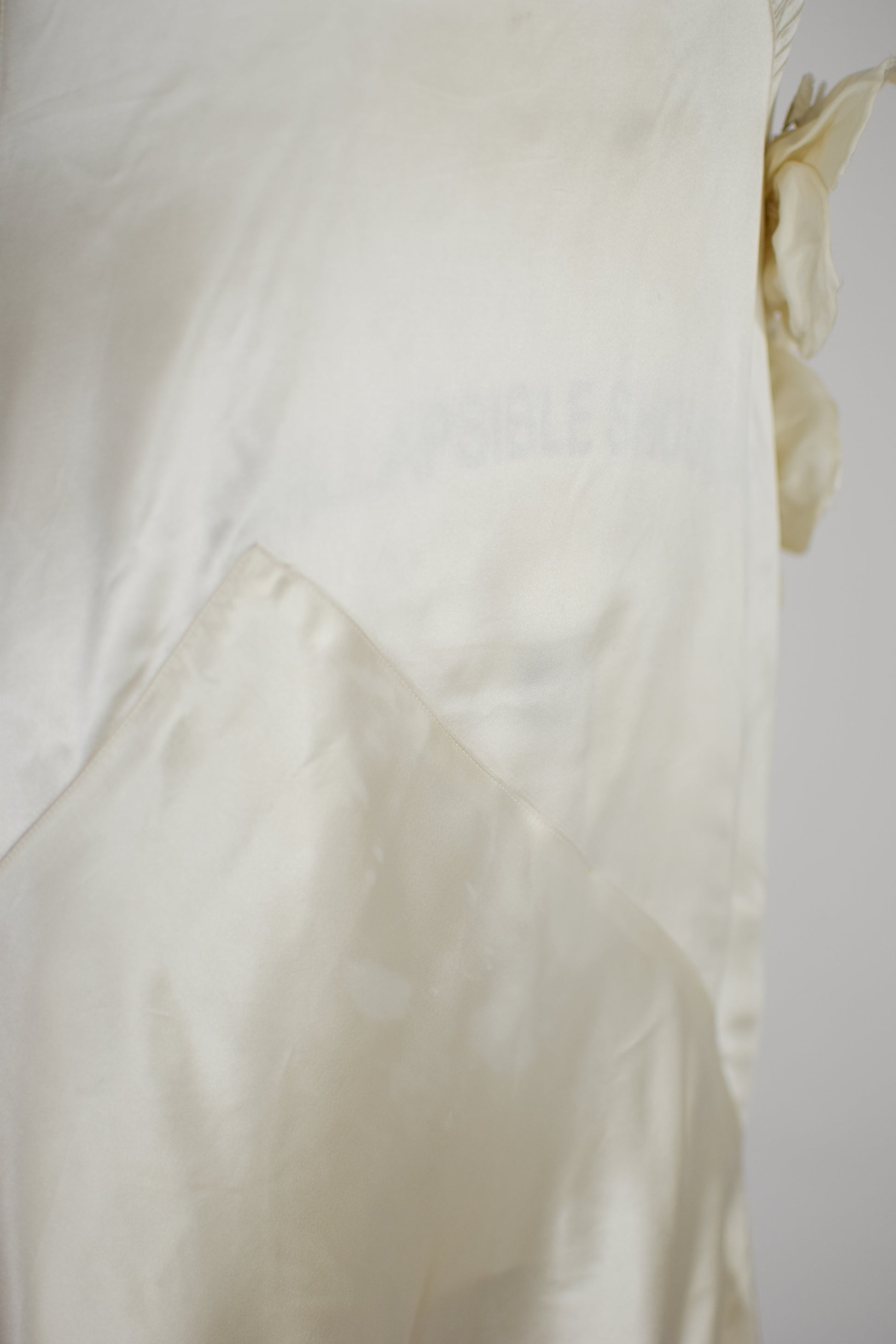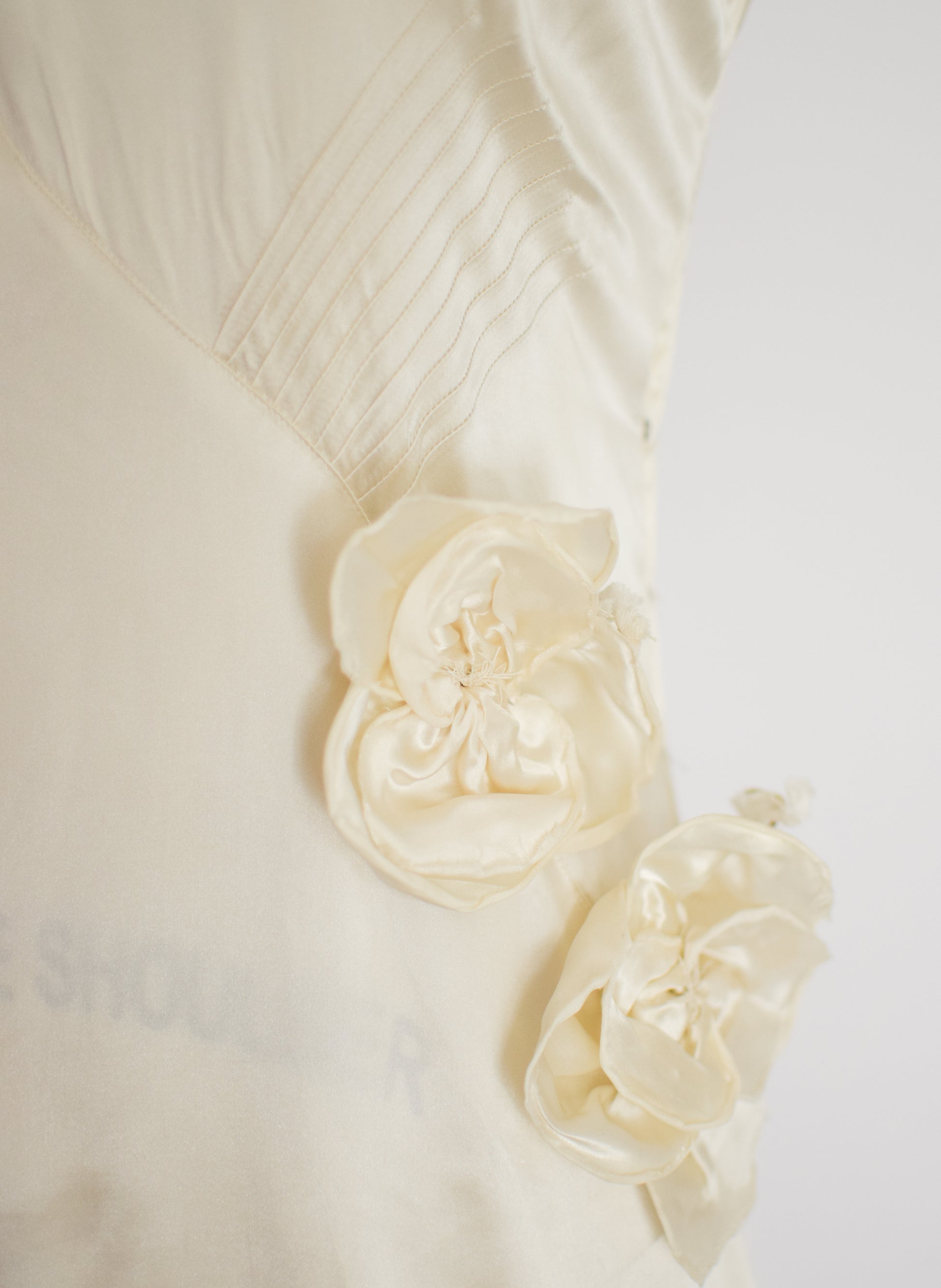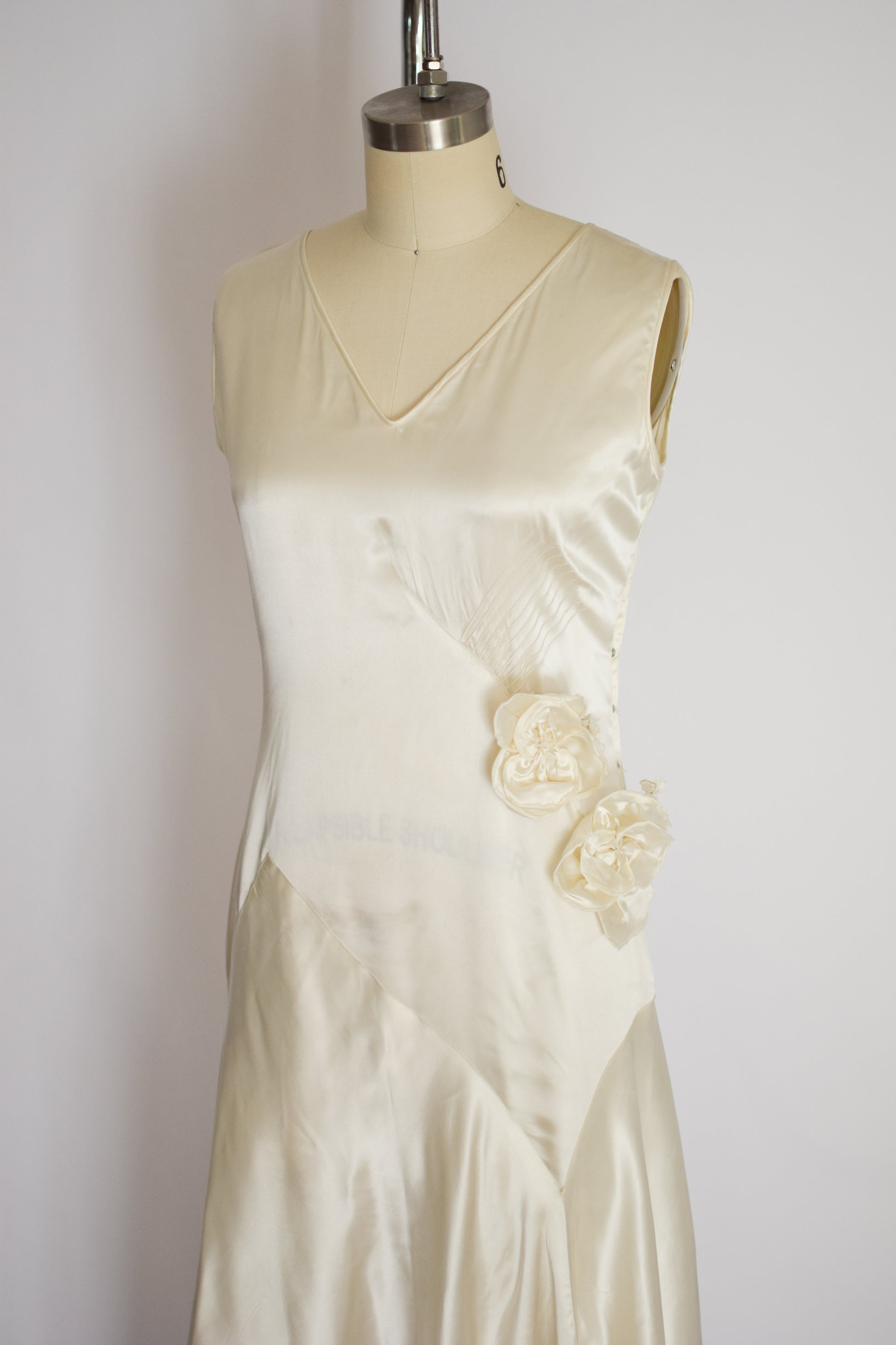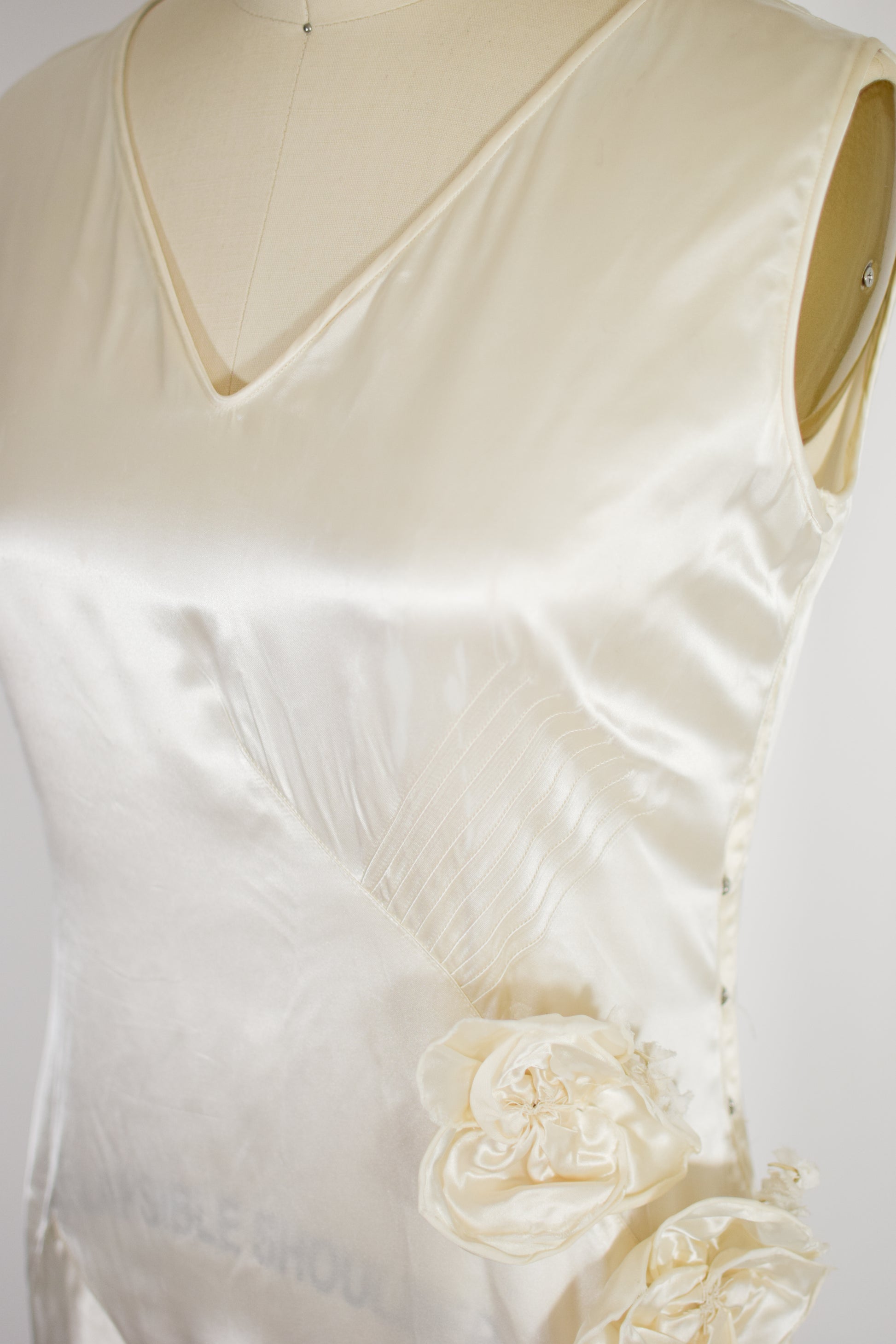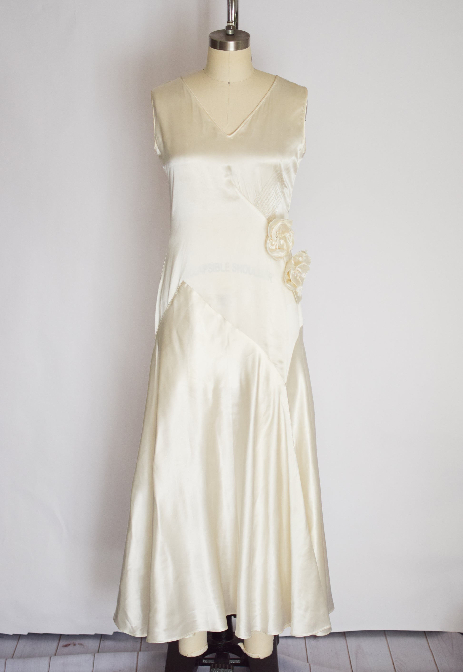 candlelight satin with ankle-length bias cut skirt and fabulous asymmetrical dropped waist seaming. pin-tucking detail and matching satin flowers along the left side of the bodice. snaps up the side seam. please note, satin translates a bit lighter in natural light than in these studio photos.