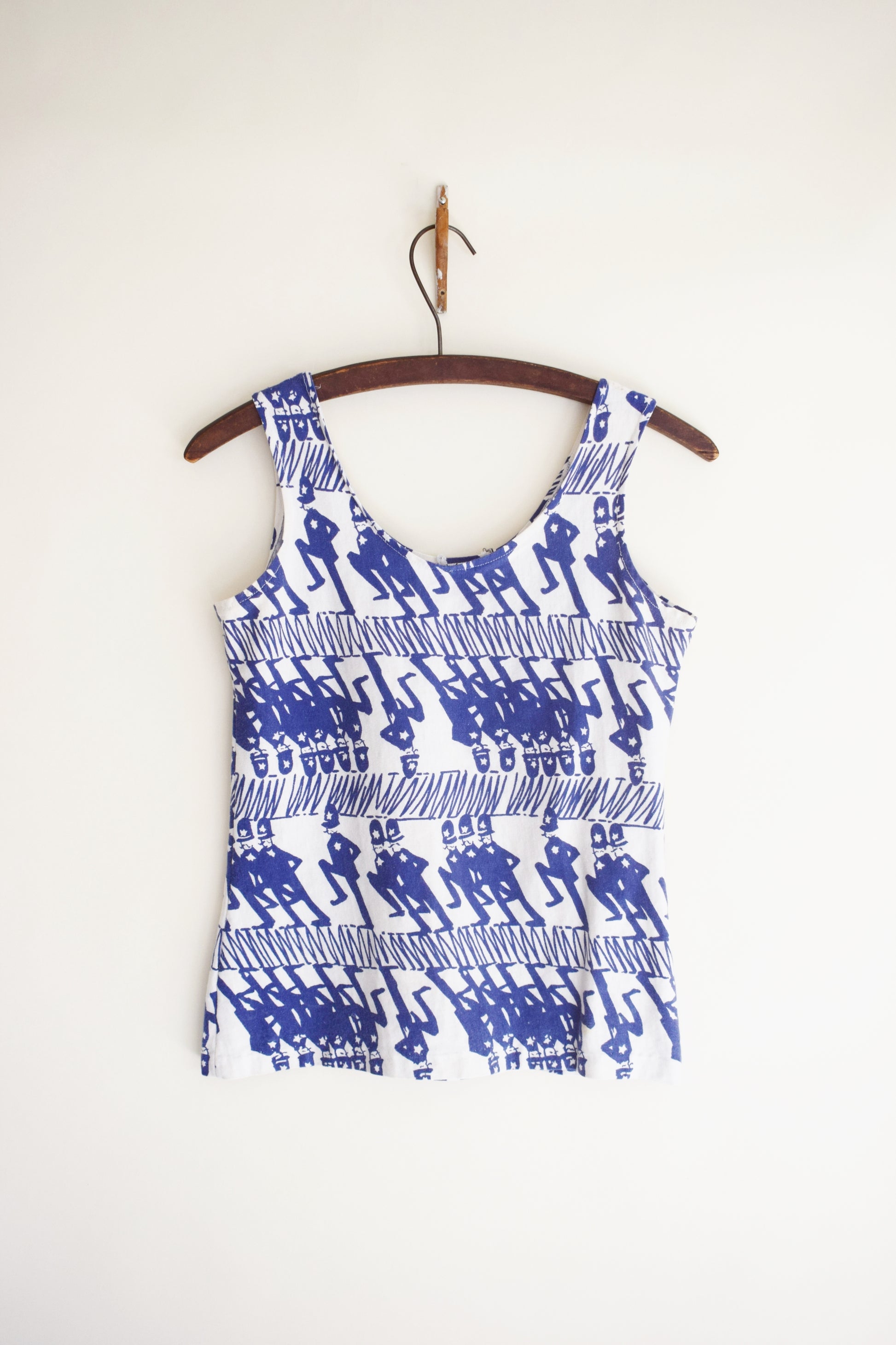 cotton jersey knit tank with playful print of trotting mustachioed Bobbies.
