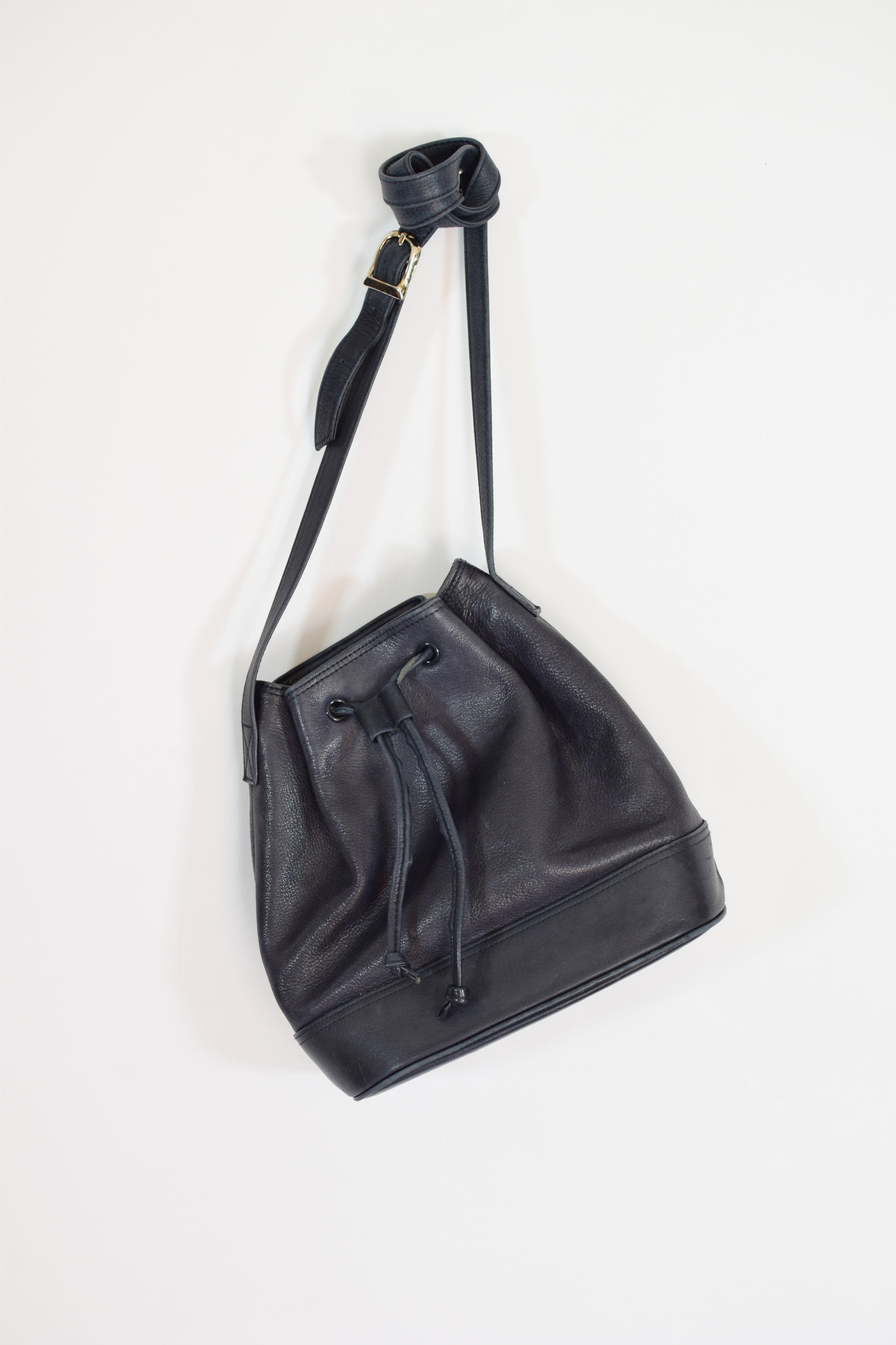 midnight blue leather tote with drawstring top and adjustable shoulder strap.
