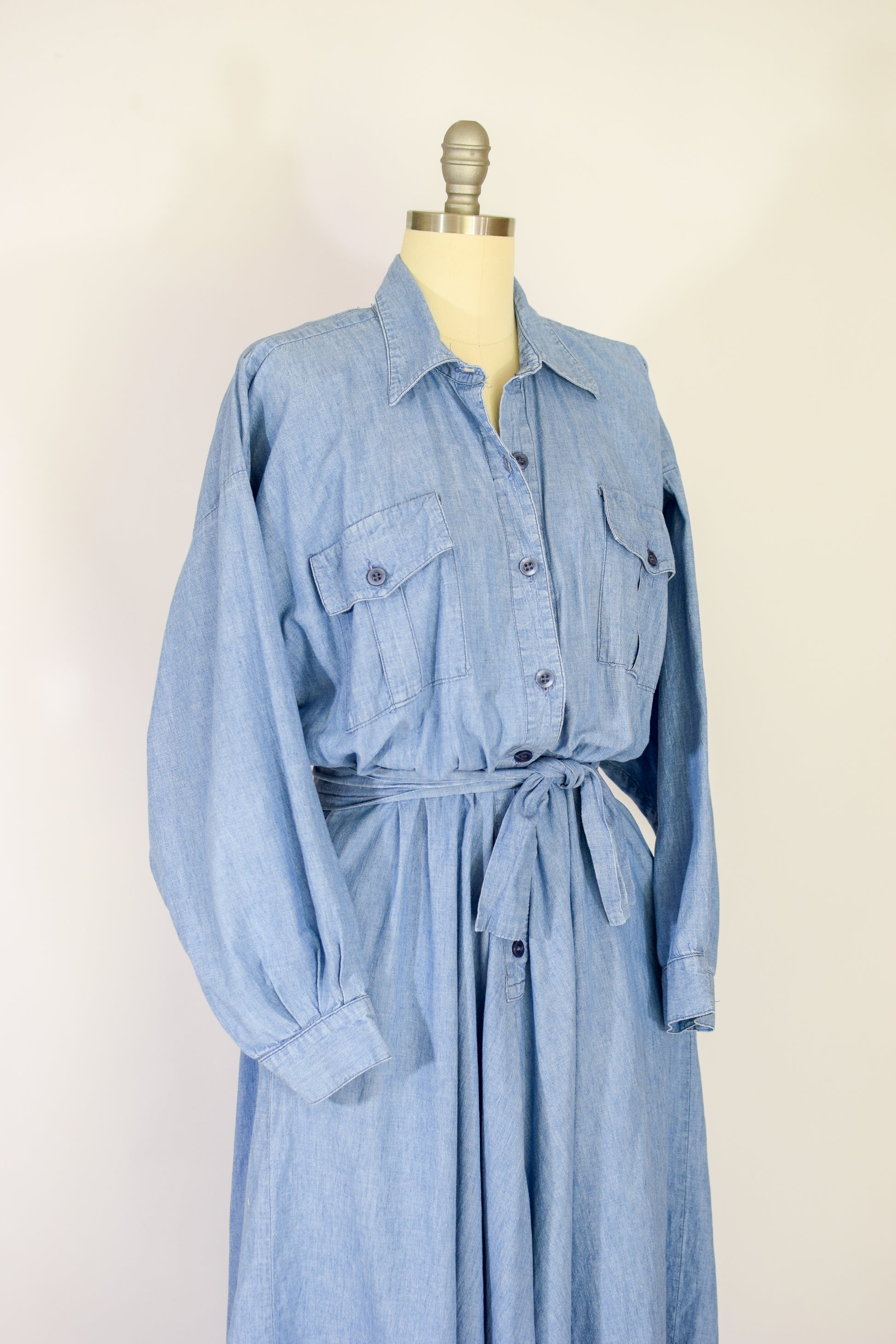 lightweight cotton denim in a button-front style with full skirt, pockets and fabric tie belt. a classic!