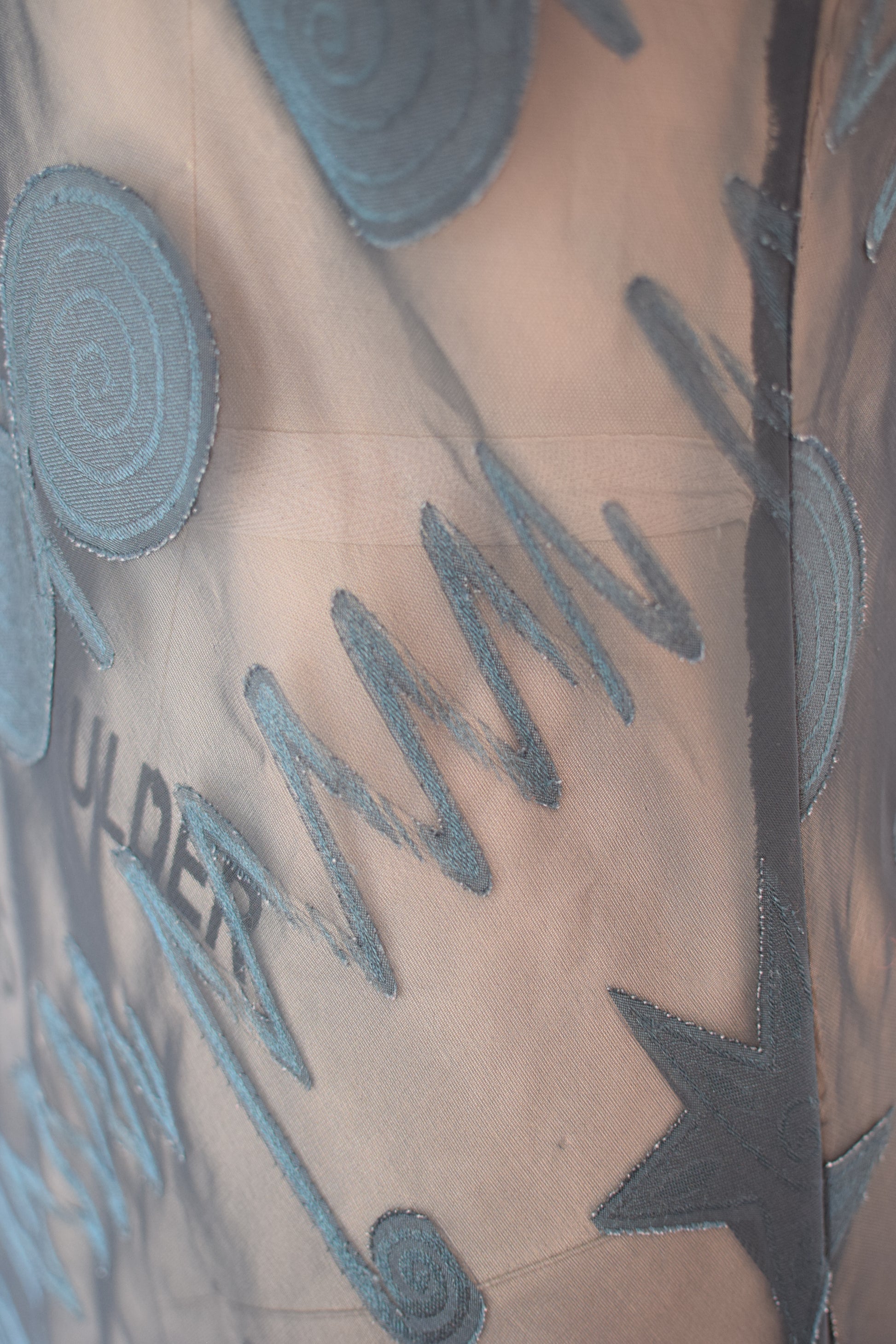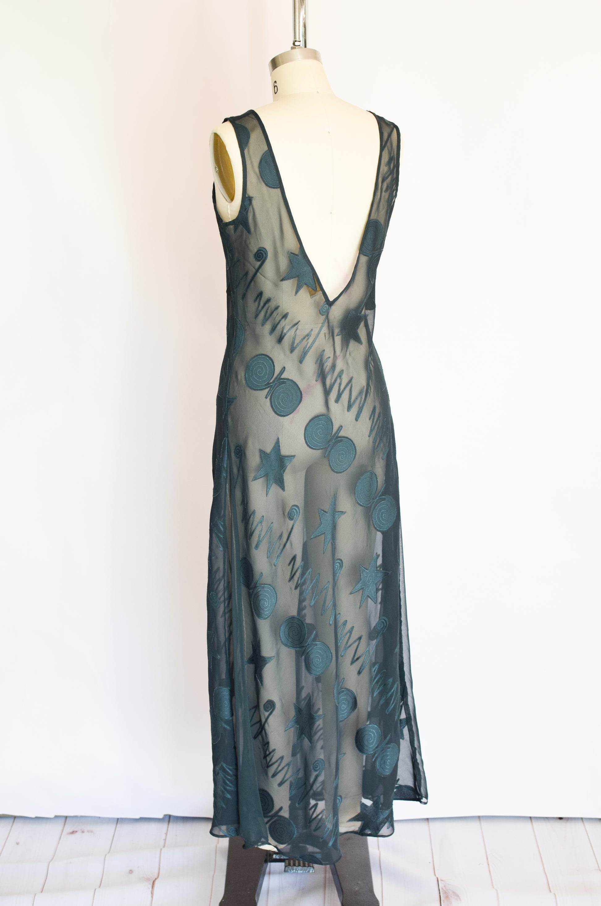 sheer forest green chiffon with woven star and squiggle contrast motif. bias cut with low V back. slips on over head, no closures.