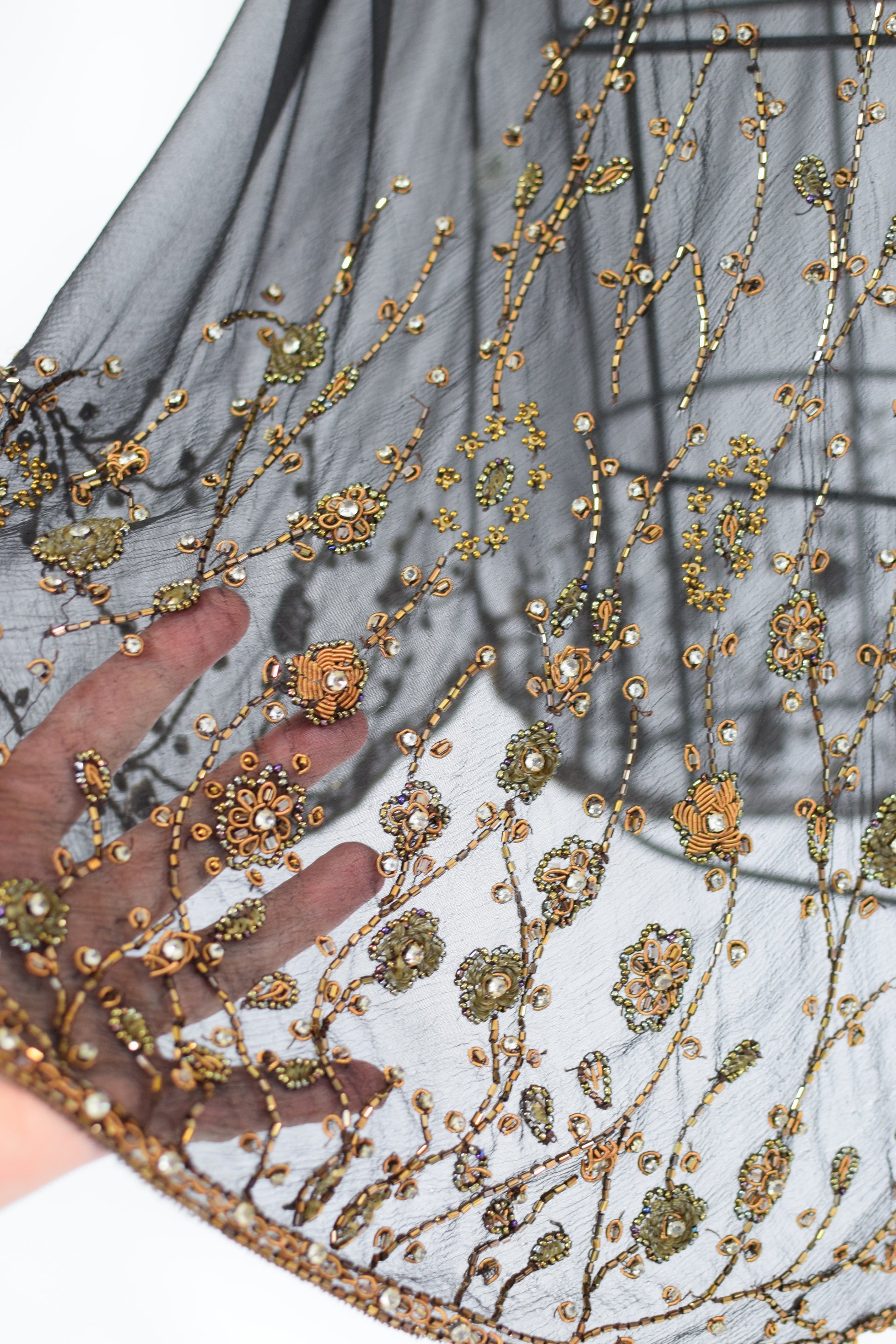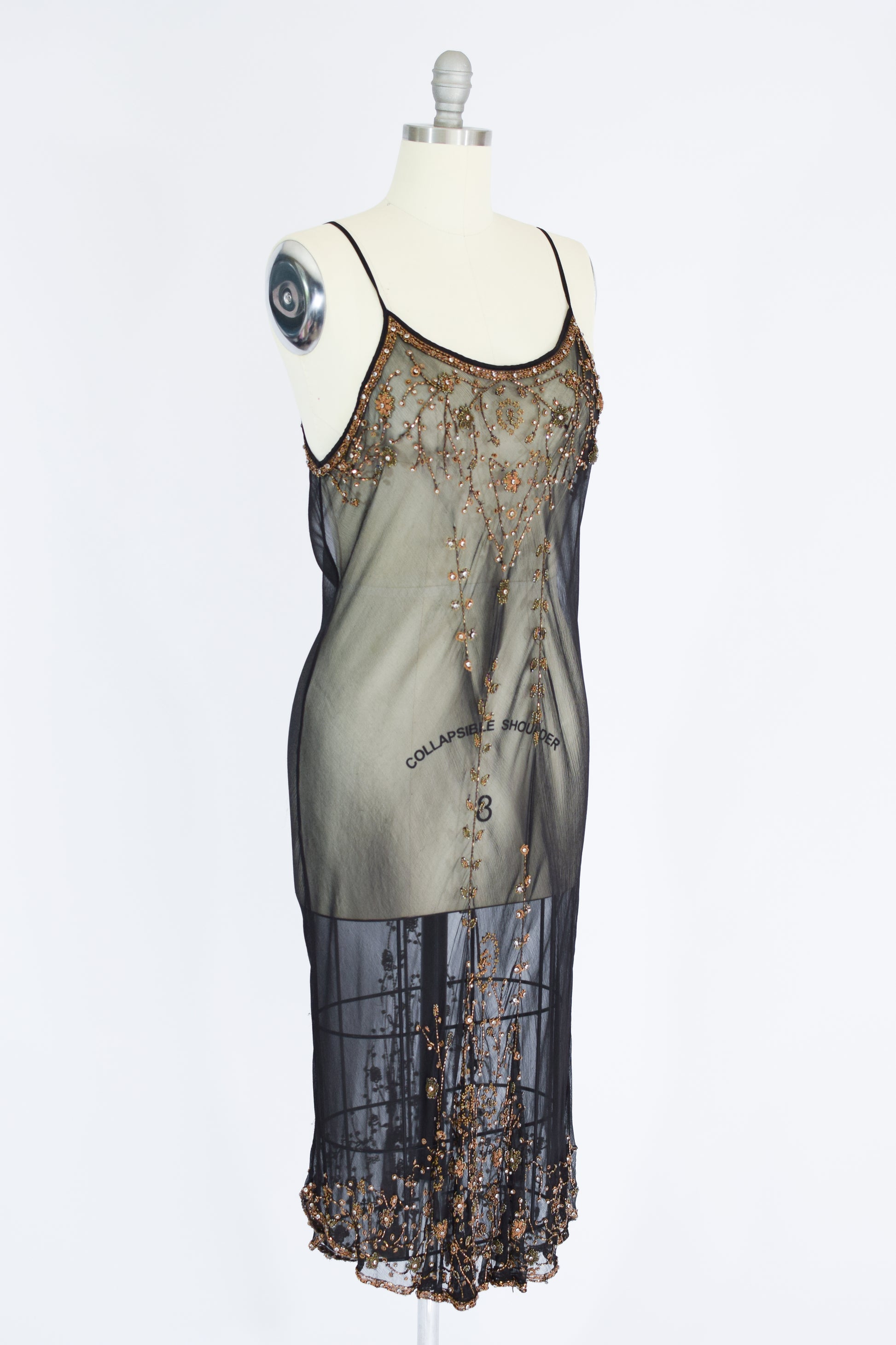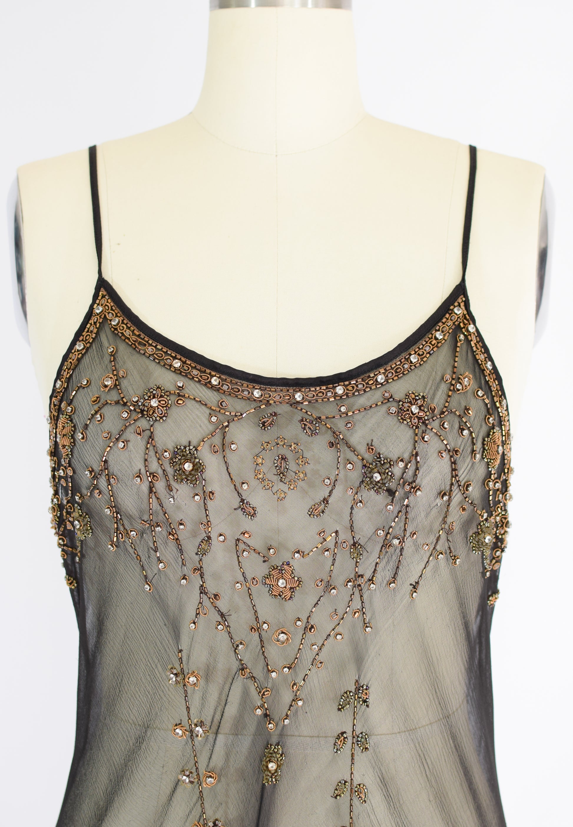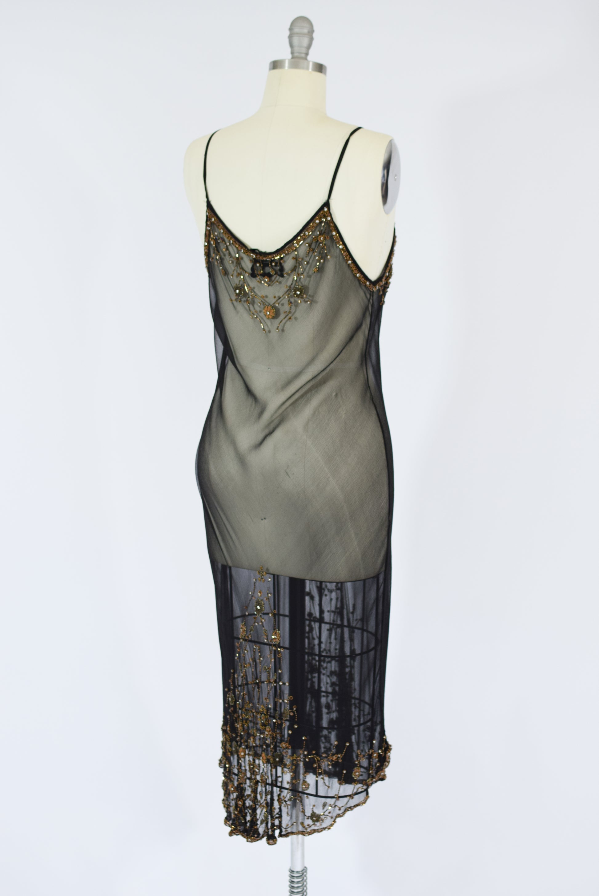 sheer black silk, bias cut, with heavy Indian-inspired metallic beading and rhinestones across the bodice and hem. low cut. slips over head.